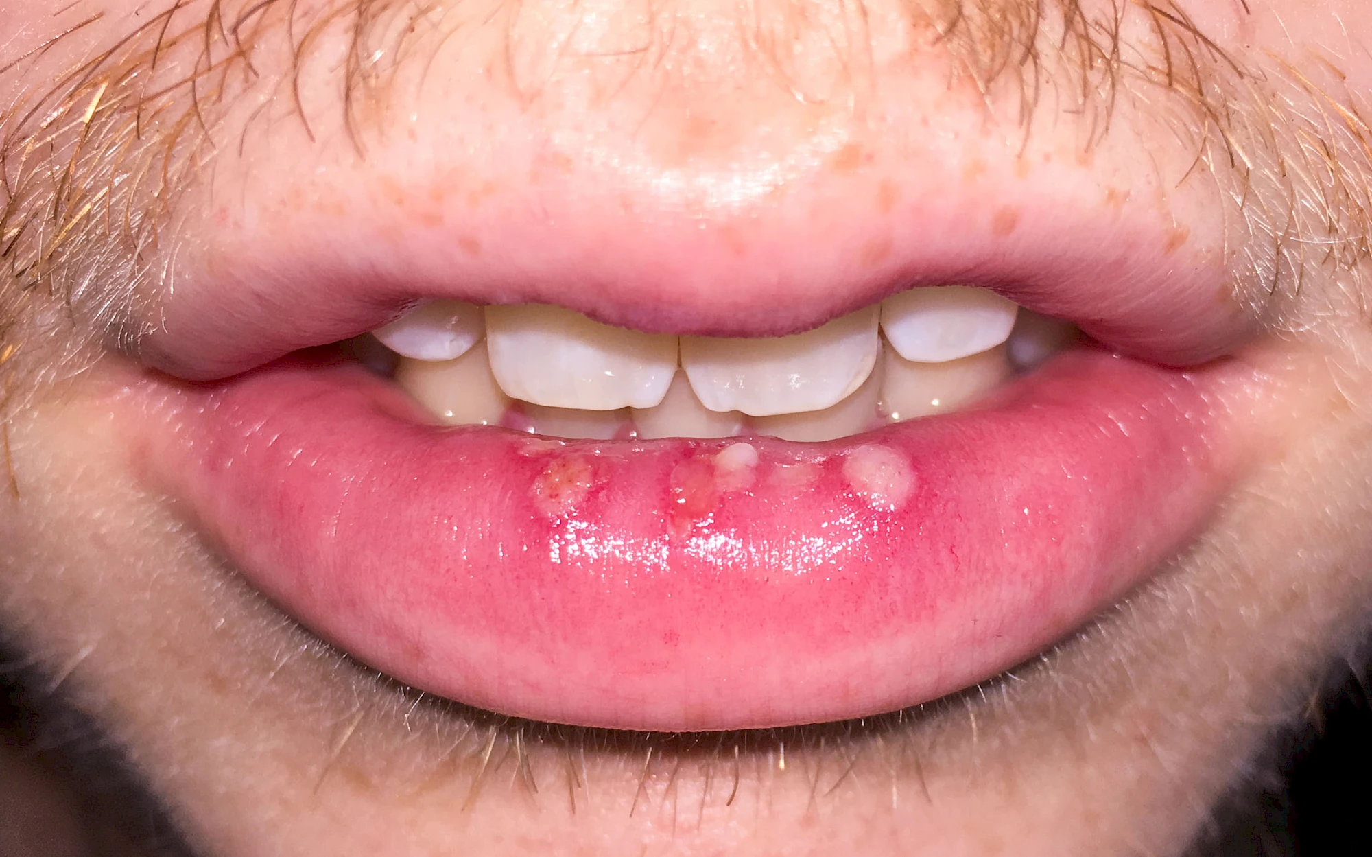 Herpes-Bläschen können ebenfalls kleine Gruppierungen von Bläschen zeigen, die dann aber – zumindest zu Beginn – streng auf einer Seite lokalisiert sind. Herpes-Viren ziehen sich nach Erstinfektion in bestimmte Strukturen der Nerven-Gewebe (Spinalganglien) zurück und können unter besonderen Bedingungen (nach Stress-Situationen, nach Sonnenexposition …) wieder "ausbrechen". Herpes-simplex Viren zeigen sich bei vielen Menschen an den Lippen. Seltener sind Schleimhautbereiche im Mund (am ehesten noch der Gaumen) betroffen. Manchmal sind auch Herpes-Zoster-Viren die Ursache.