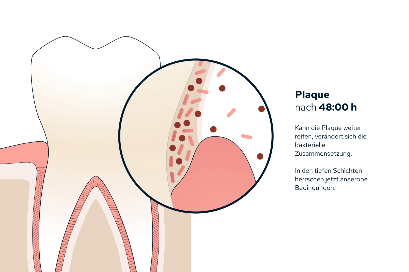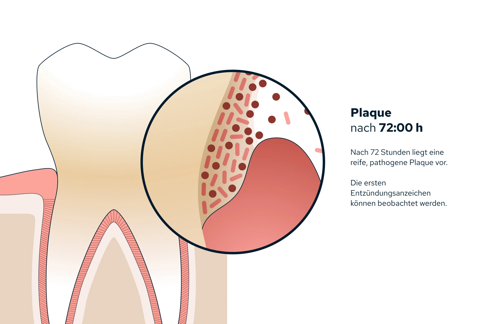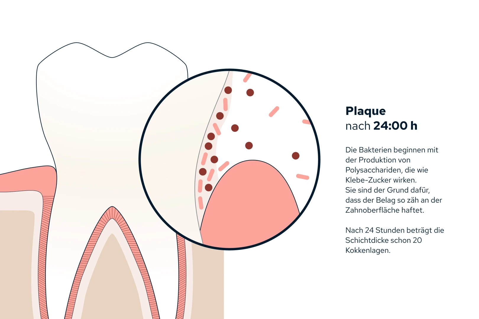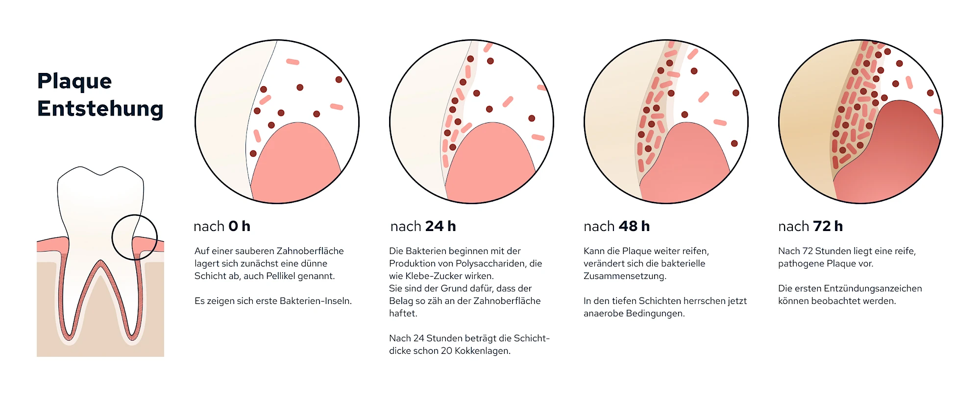 Als Plaque bzw. Biofilm bezeichnet man die Gesamtheit aller Mikroorganismen (Mikrobiom) auf der Zahnoberfläche. Werden die Zähne nicht geputzt, haften die Beläge nach 24 Stunden bereits so fest, dass diese mit der Zahnbürste schon nicht mehr vollständig entfernt werden können.