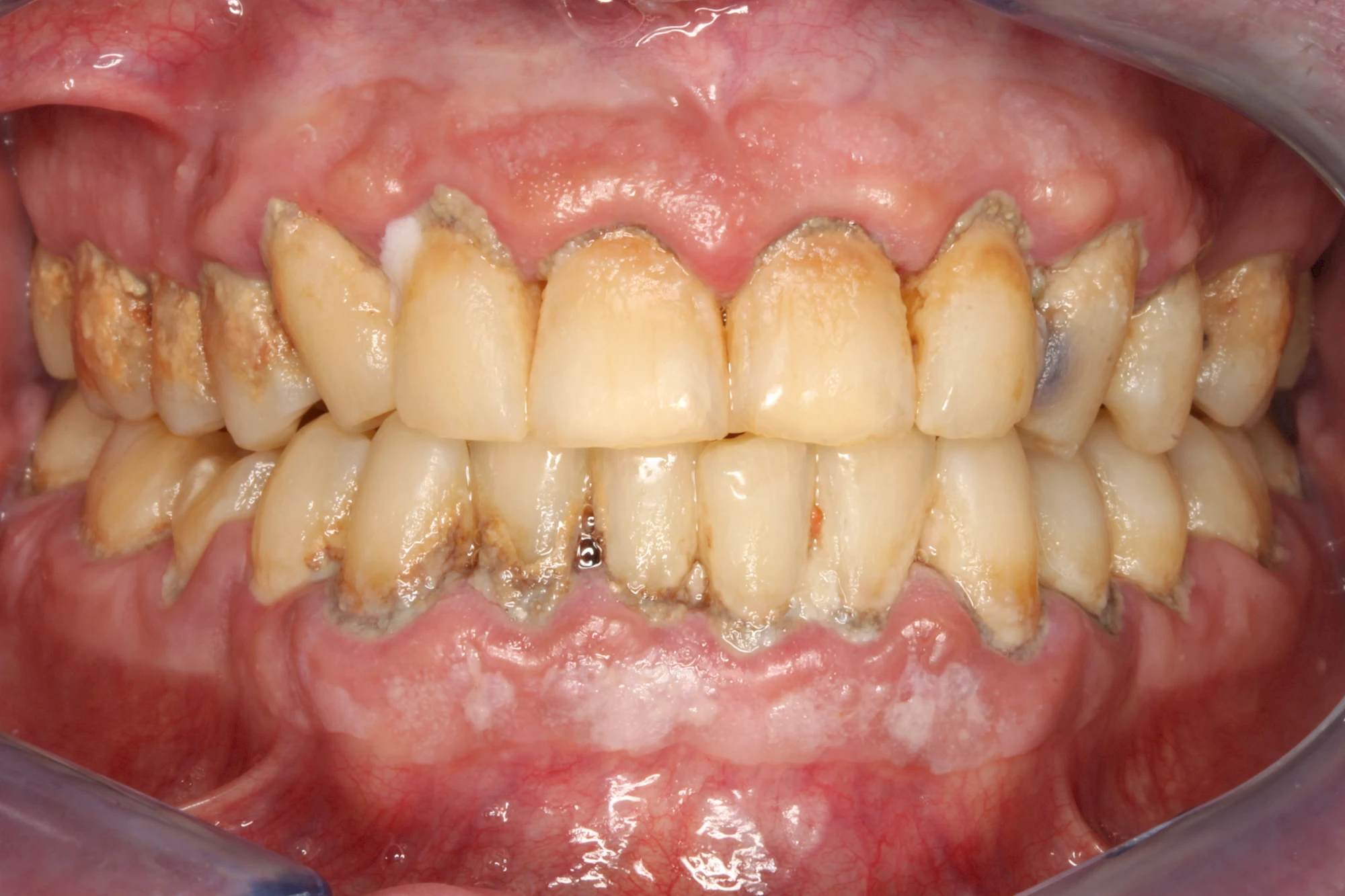 Lagern sich Mineralien wie Calcium und Phosphat aus dem Speichel in den Zahnbelag ein, so bildet sich oberhalb vom Zahnfleisch gelb-beiger harter Zahnstein. Zahnstein kann nicht mit der Zahnbürste weggeputzt werden und erschwert die Mundhygiene zusätzlich.