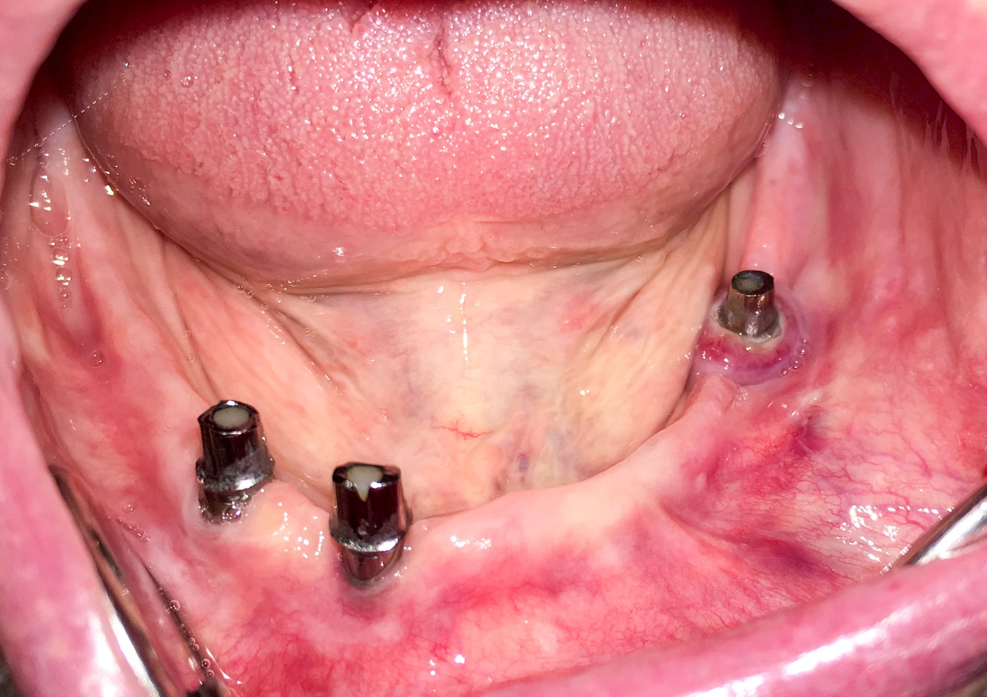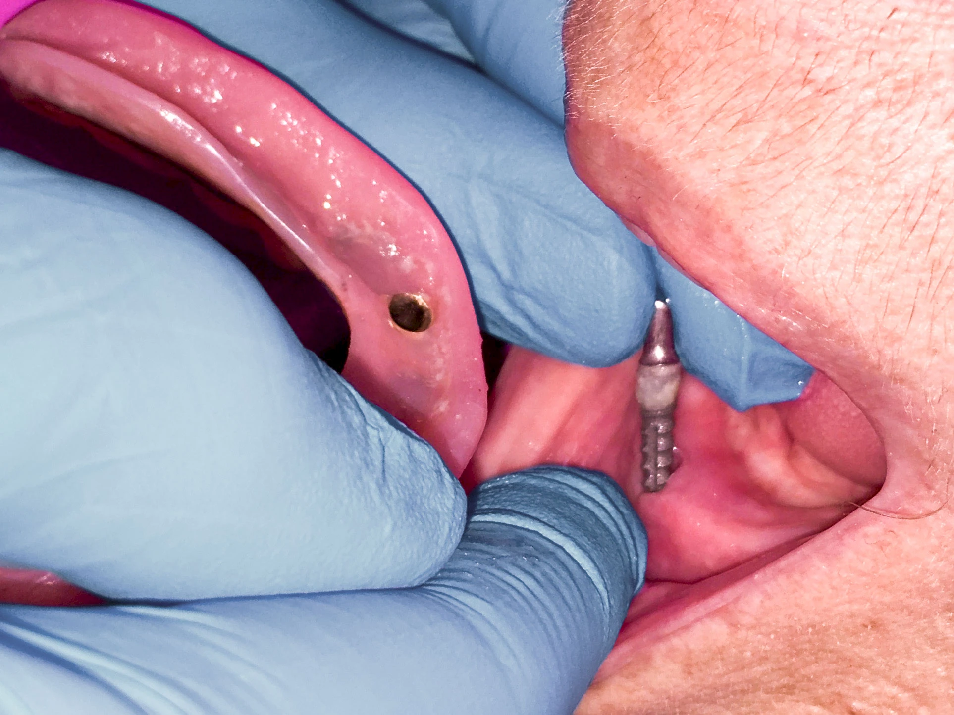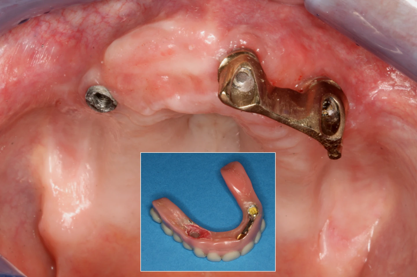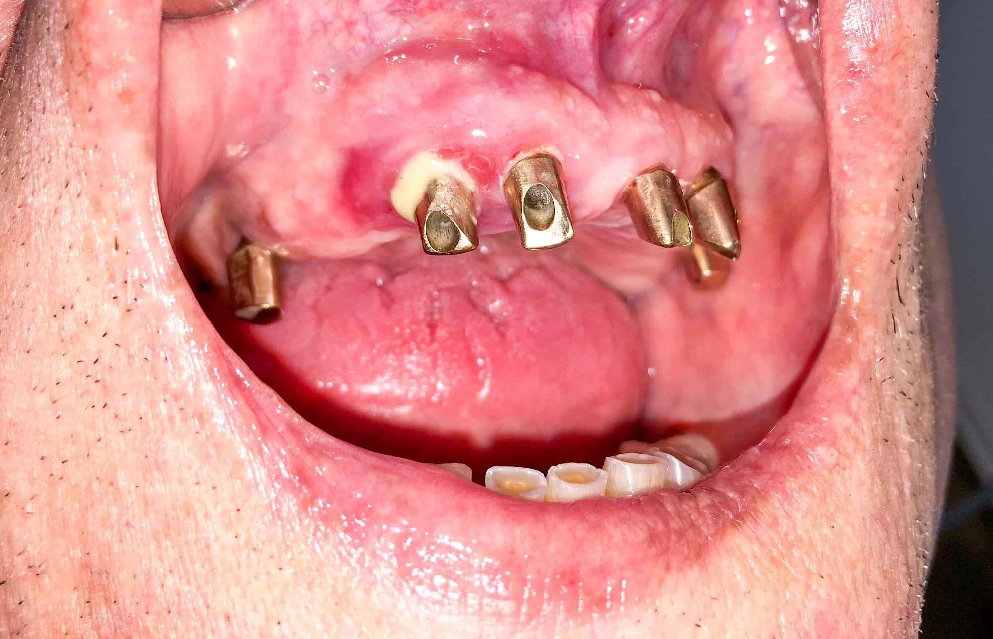 Die knöcherne Verbindung zum Implantat geht verloren und das Implantat ist gelockert (dumpfer Klopfschall), lässt sich entnehmen oder ist bereits herausgefallen. - Lockerung bzw. Bruch des Implantataufbaus