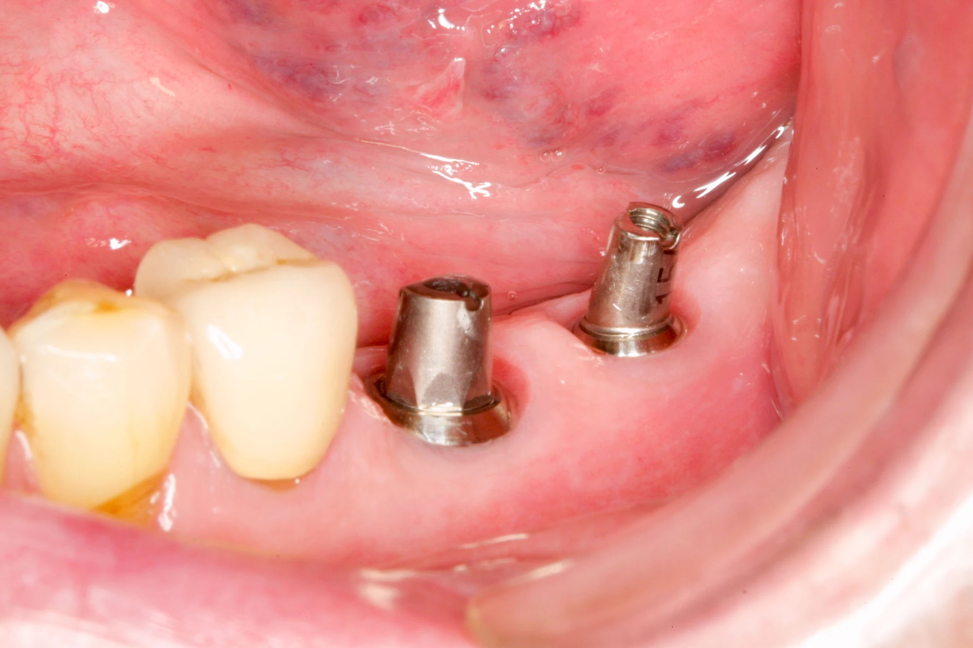 Implantate sind künstliche Zahnwurzeln. Nach einer gewissen Einheilzeit im Knochen (meist 3-6 Monate) erfolgt über einen separaten Aufbau (Abutment) die Befestigung einer Krone bzw. Brücke oder Zahnprothese.