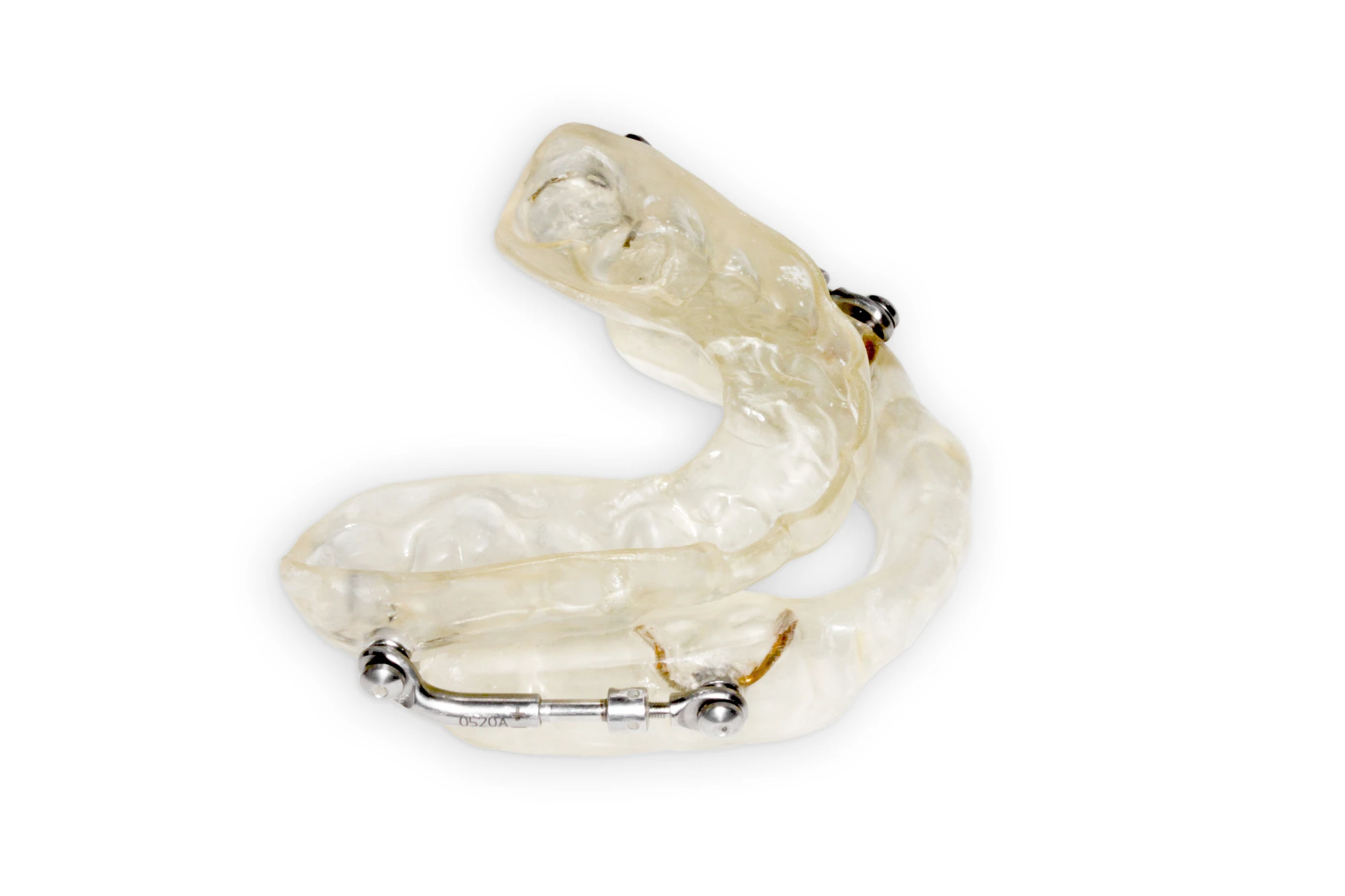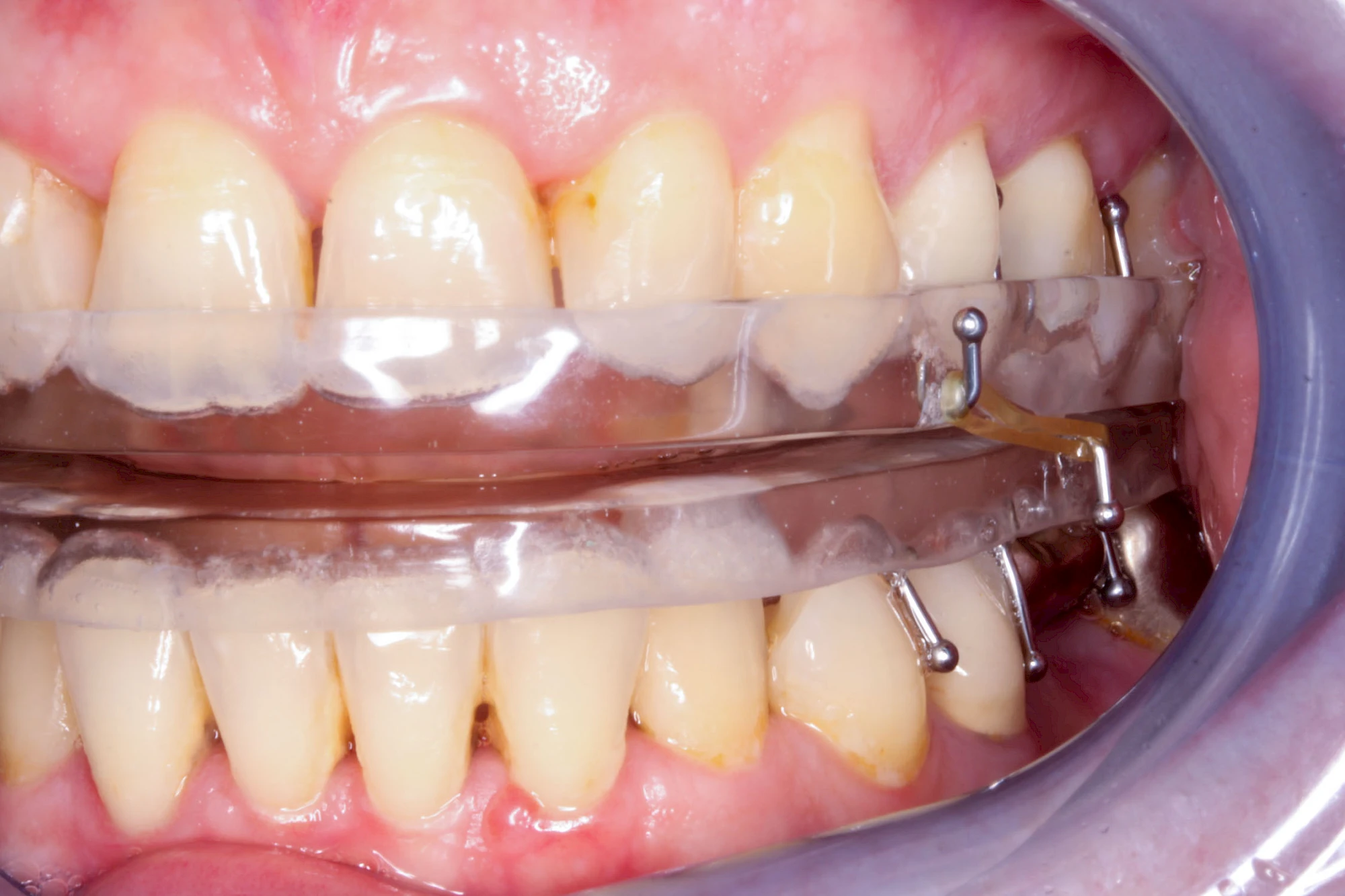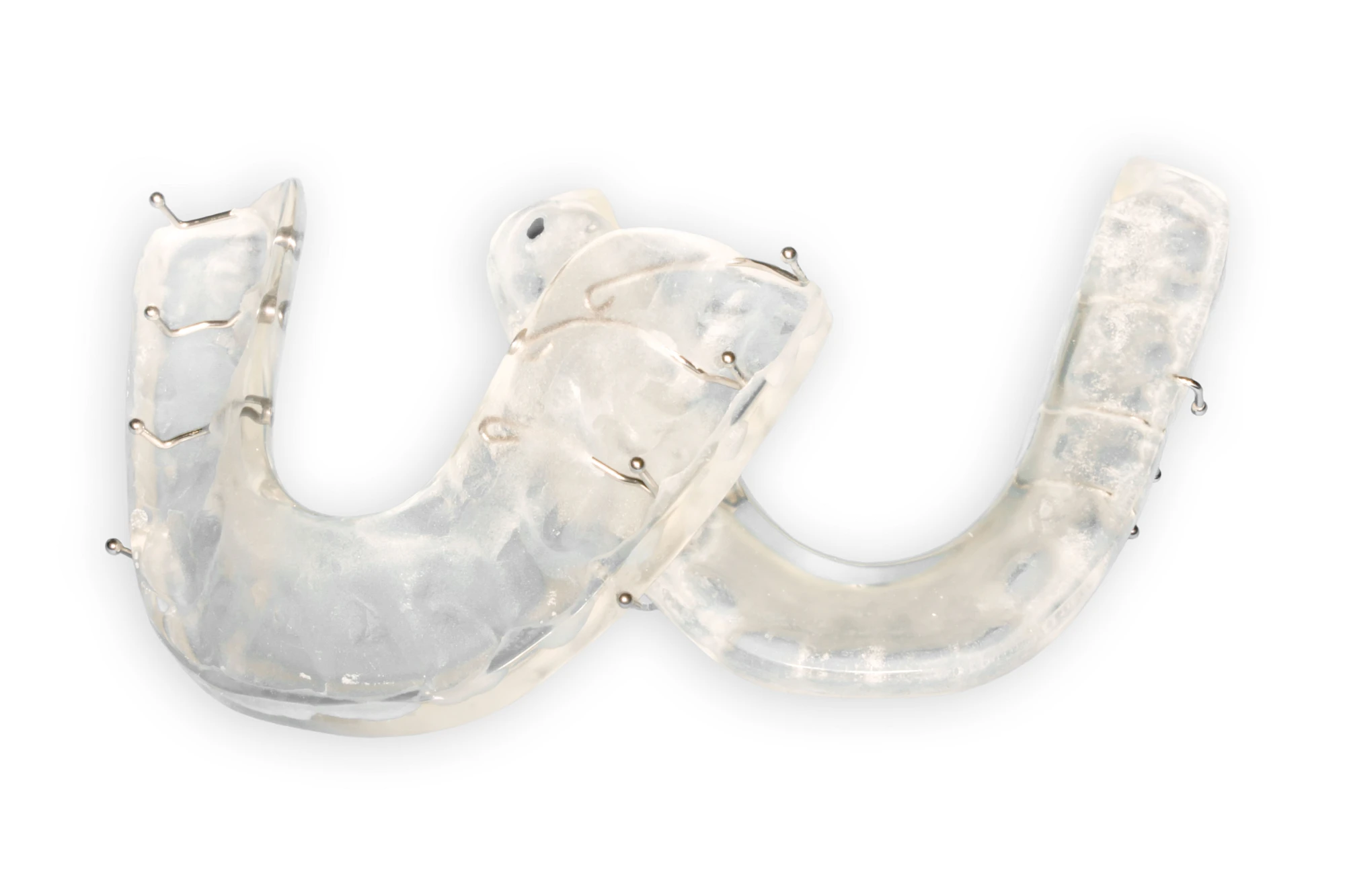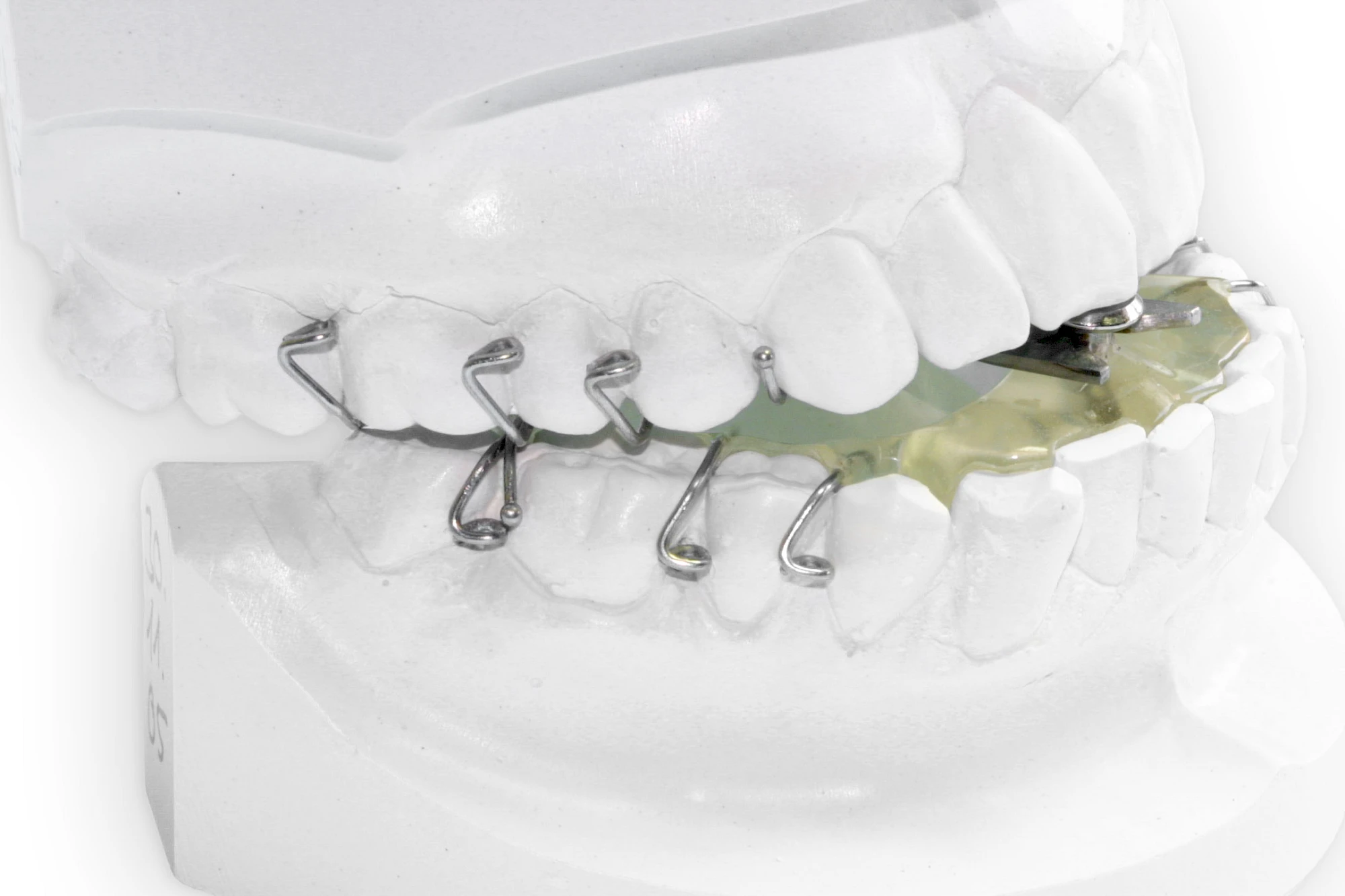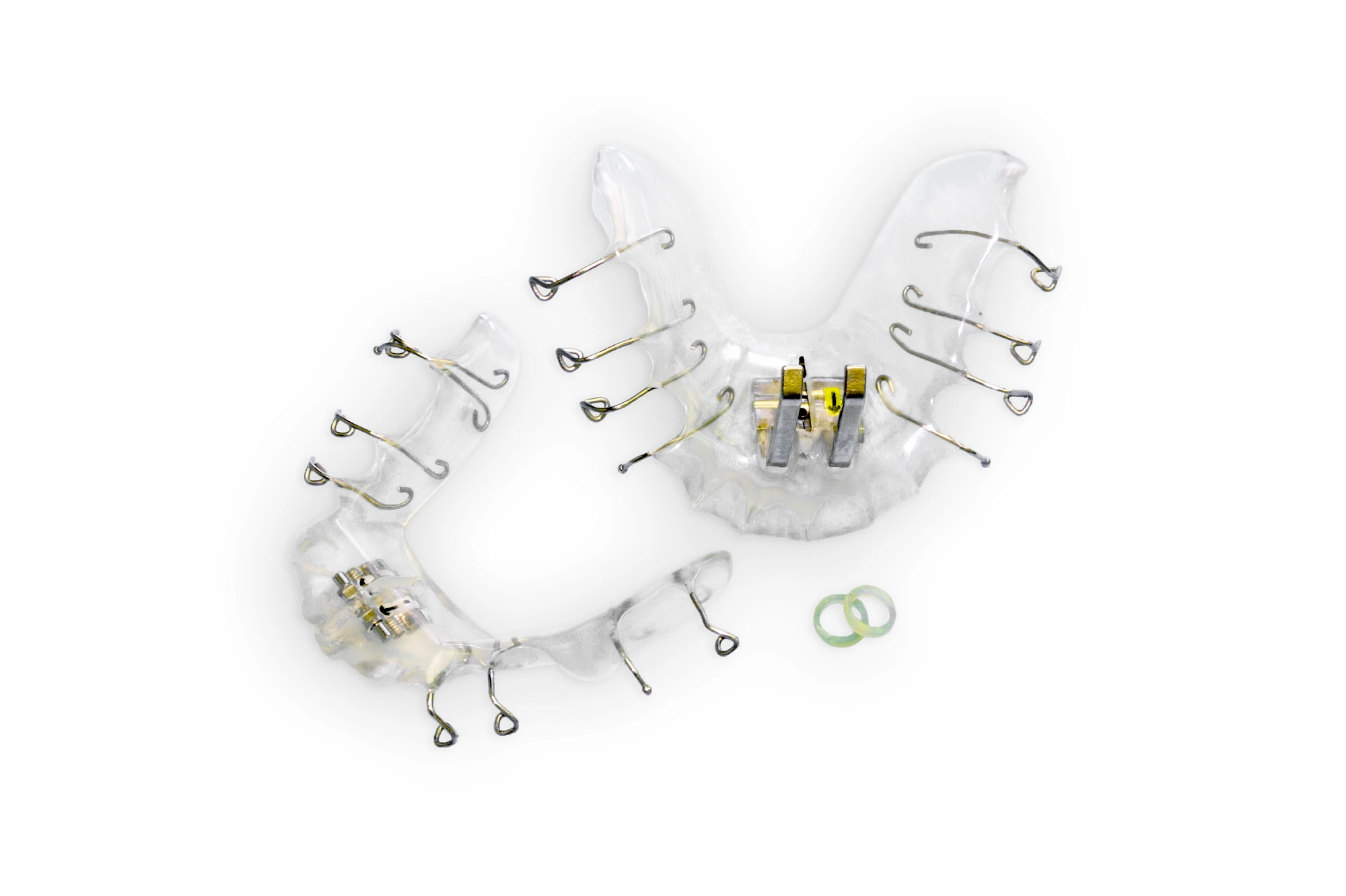 - Herausnehmbare Spangen jeweils für Oberkiefer und Unterkiefer mit gebogenen Drahtklammern