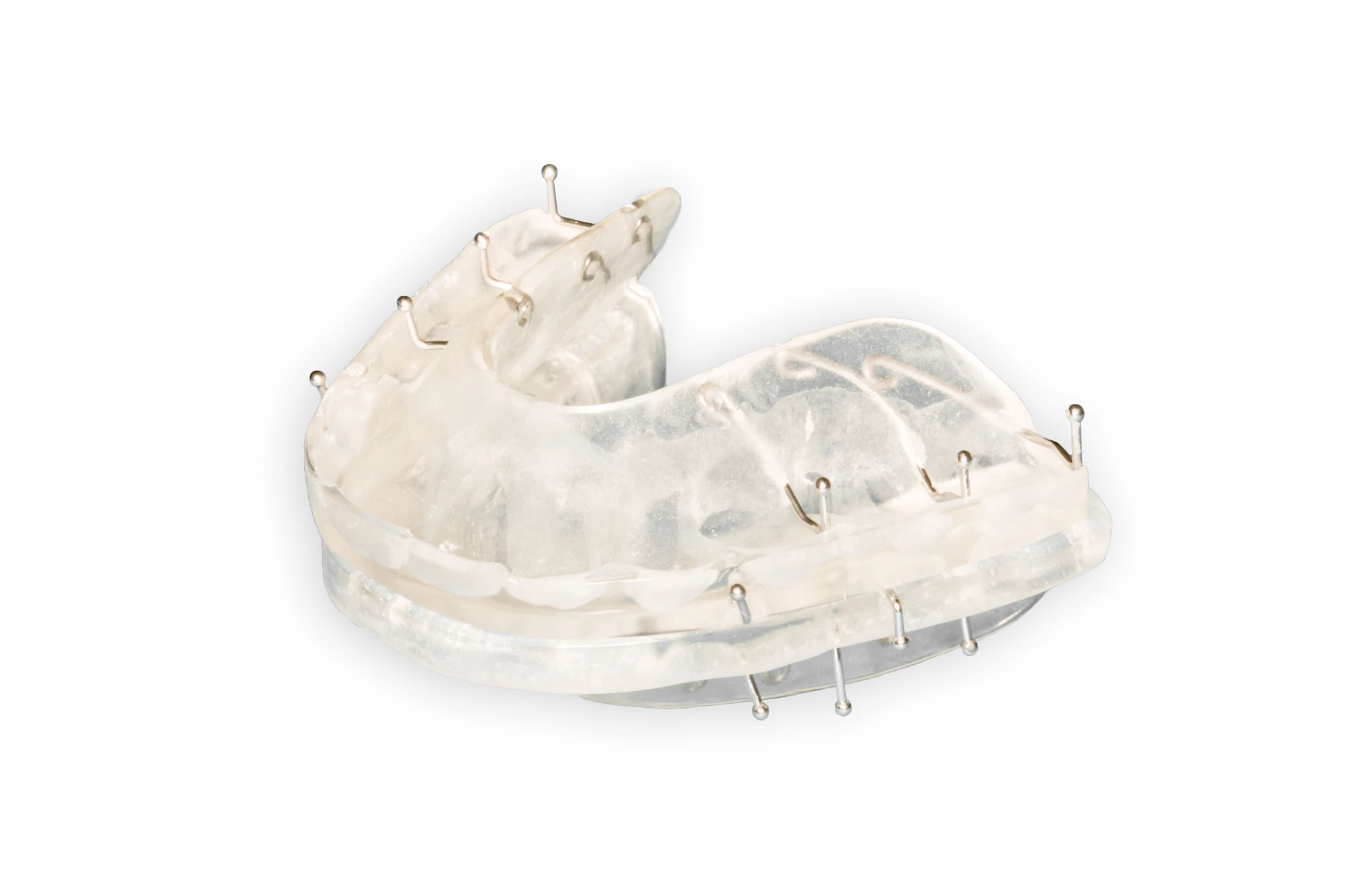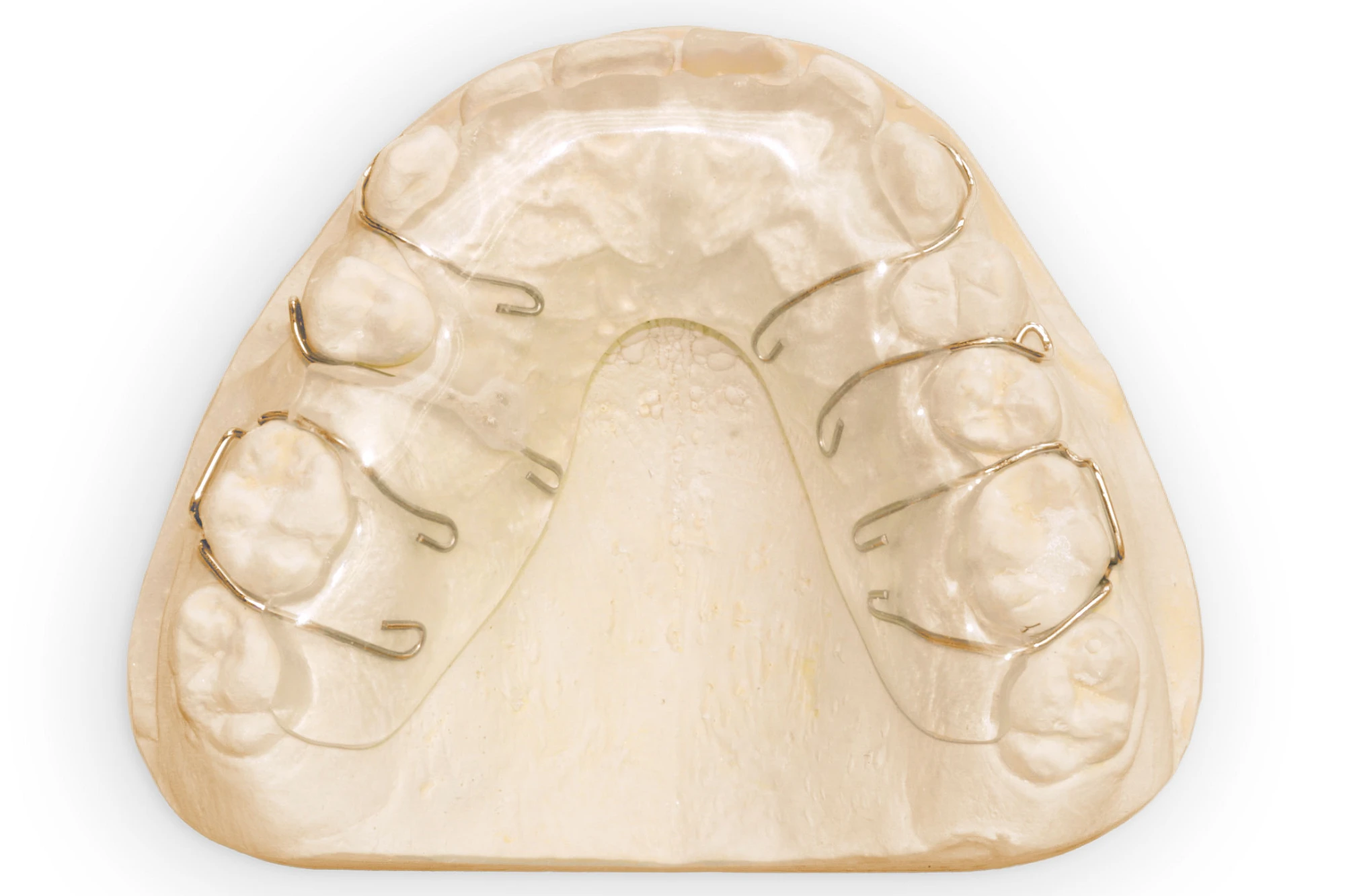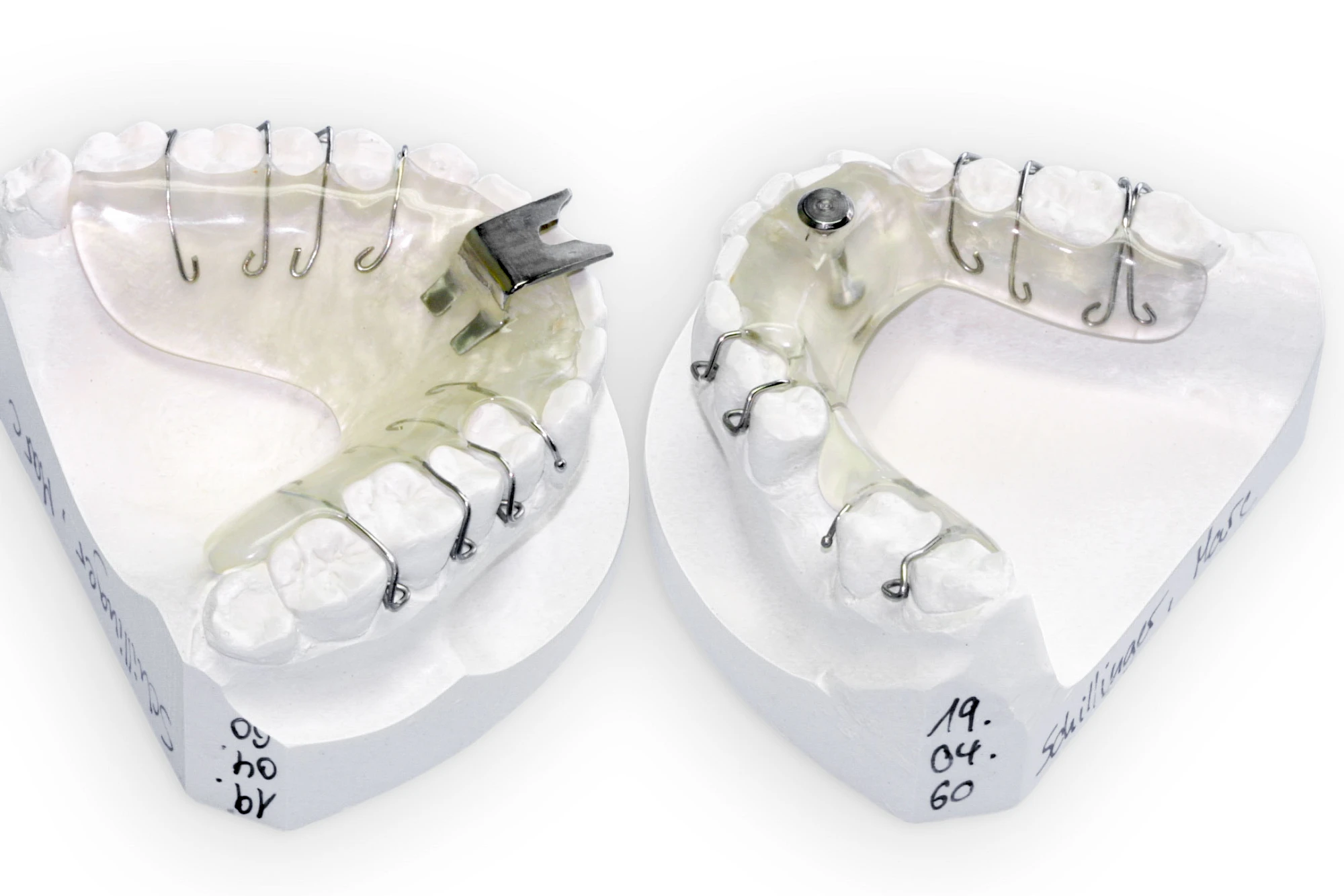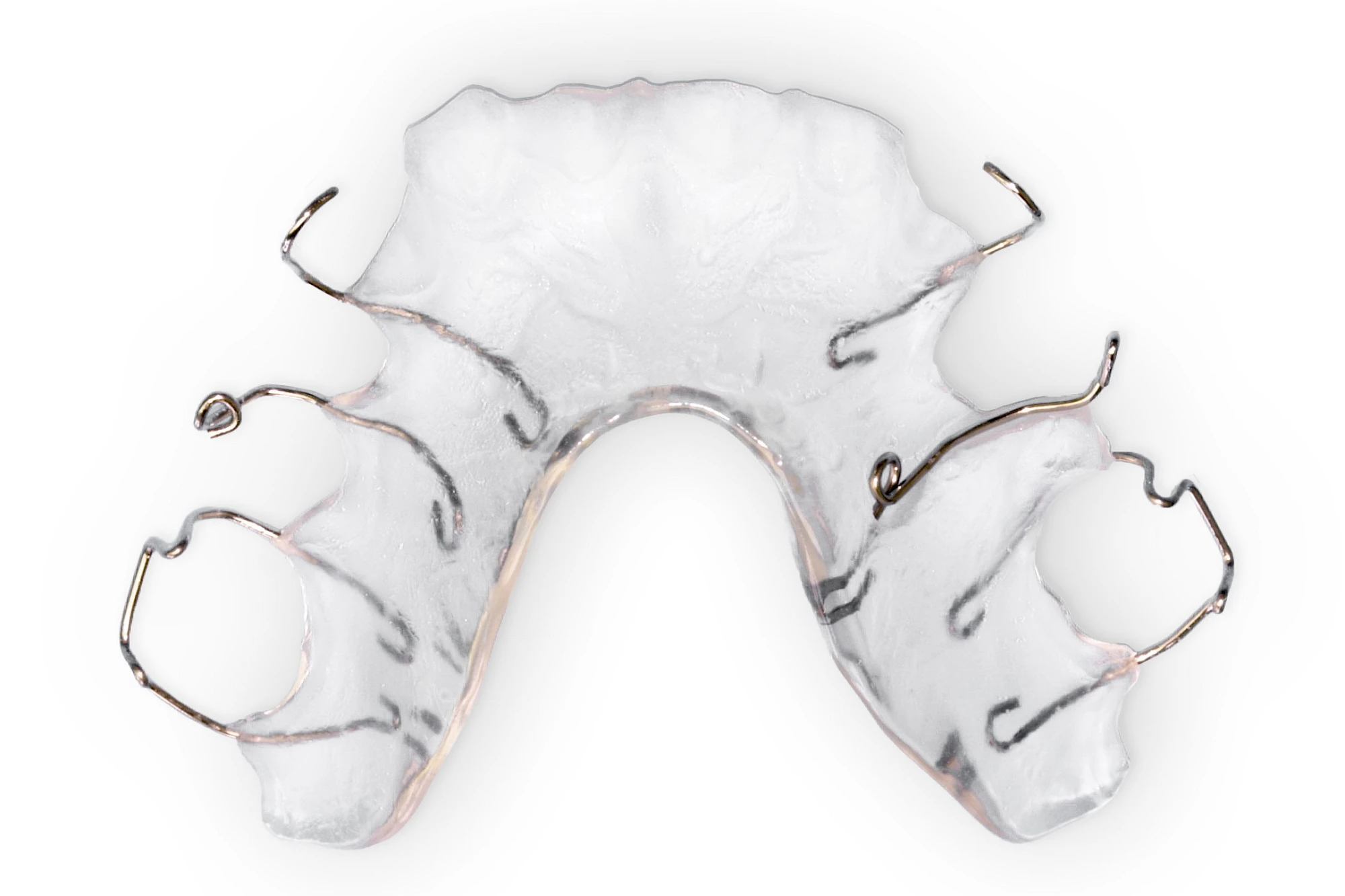 - Herausnehmbare Spangen am Stück für Oberkiefer und Unterkiefer mit gebogenen Drahtklammern