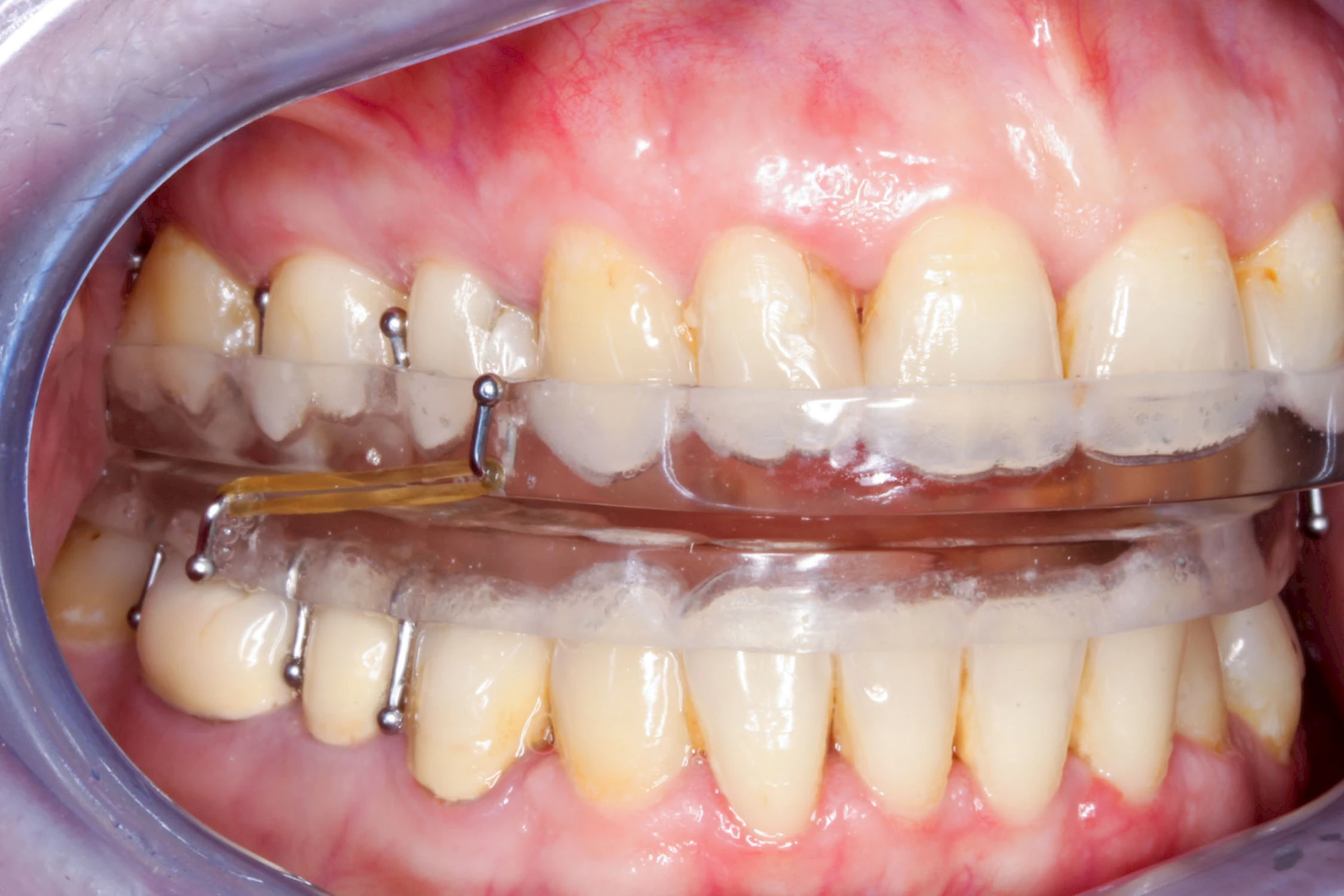 - Drahtelemente mit Kunststoff direkt an den Zähnen z. B. im Oberkiefer oder Unterkiefer befestigt, um dauerhaft die Zahnstellung zu stabilisieren (Retainer)