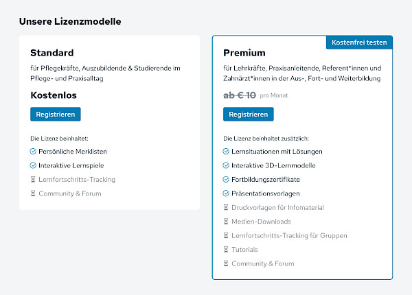 - Die Premium-Lizenz umfasst zusätzlich neben den bisher bekannten Fortbildungs-Funktionen wie z. B. Lernsituationen, Teilnahmebescheinigungen und Präsentationsvorlagen die Möglichkeit, Präsentationen individuell anzupassen (siehe oben). Zudem können Sie alle Grafiken sowie die klinischen Fotos und Filme in höchster Qualität herunterladen und für eigene Lehr- und Lernmittel nutzen. In Kürze stellen wir für registrierte Nutzer mit Premium-Lizenz auch Druckvorlagen (Lernposter, Flyer, ...) zur Verfügung und schon bald können Sie aus unseren Quizfragen eigene Lernzielkontrollen für Ihren Unterricht zusammenstellen.