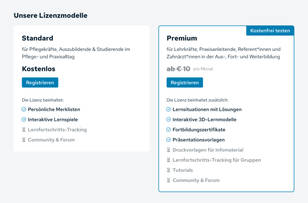 - Die Premium-Lizenz umfasst neben den bisher bekannten Fortbildungs-Funktionen wie z. B. die Lernsituationen und Teilnahmebescheinigungen neuerdings Präsentationsvorlagen für die Aus- und Fortbildung. In Kürze stellen wir in der Premium-Lizenz zudem Druckvorlagen (Lernposter, Flyer, ...) zur Verfügung. Schon bald können Sie aus den bestehenden Quizfragen eigene Lernzielkontrollen für den Unterricht zusammenstellen.