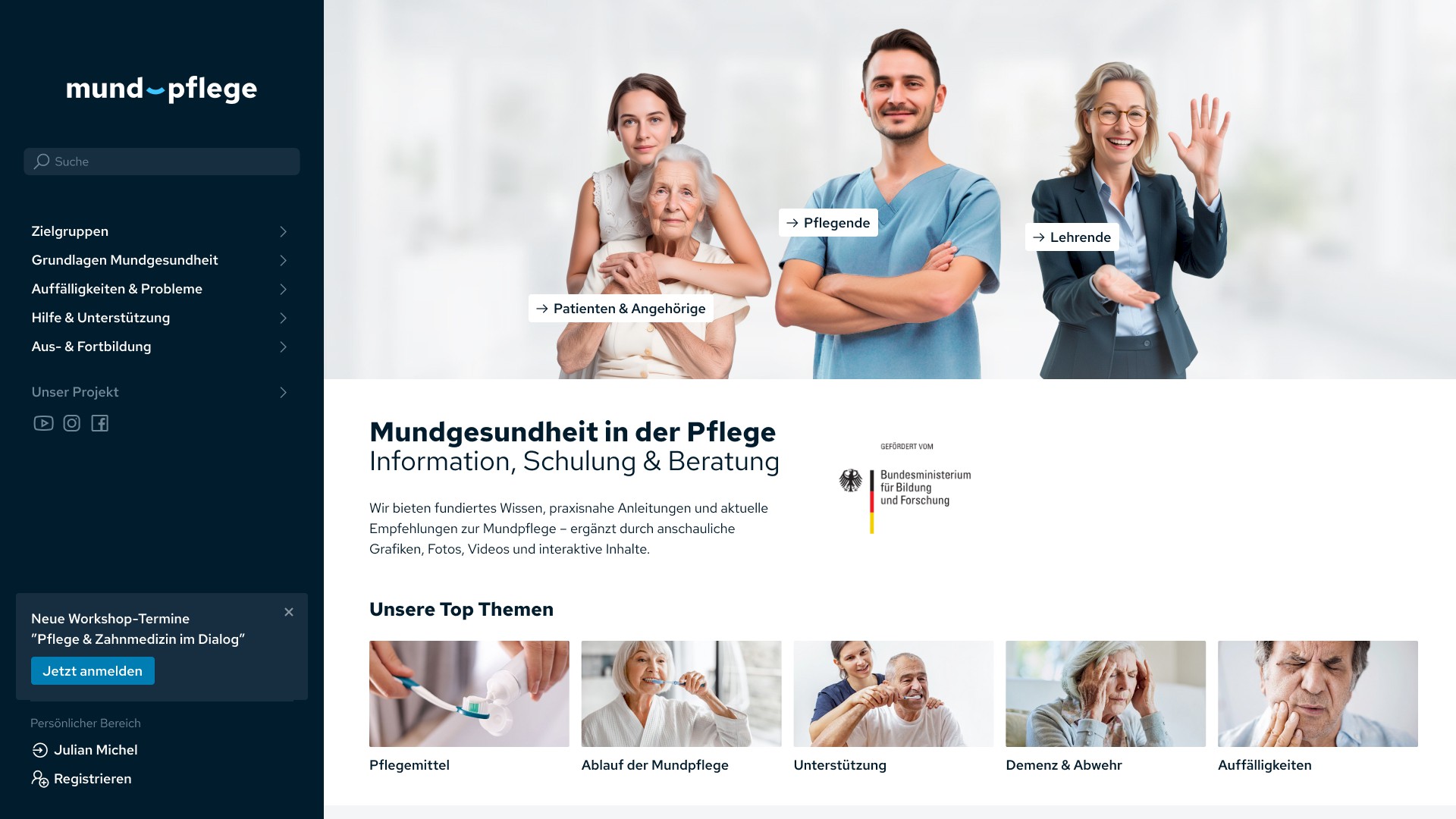 31.10.2024Die durch das Bundesministerium für Bildung und Forschung (BMBF) geförderte Projektphase wurde planmäßig abgeschlossen. Der Betrieb und die Weiterentwicklung der Plattform werden nahtlos fortgeführt und perspektivisch durch den Verein „mund-pflege e.V.“ getragen.