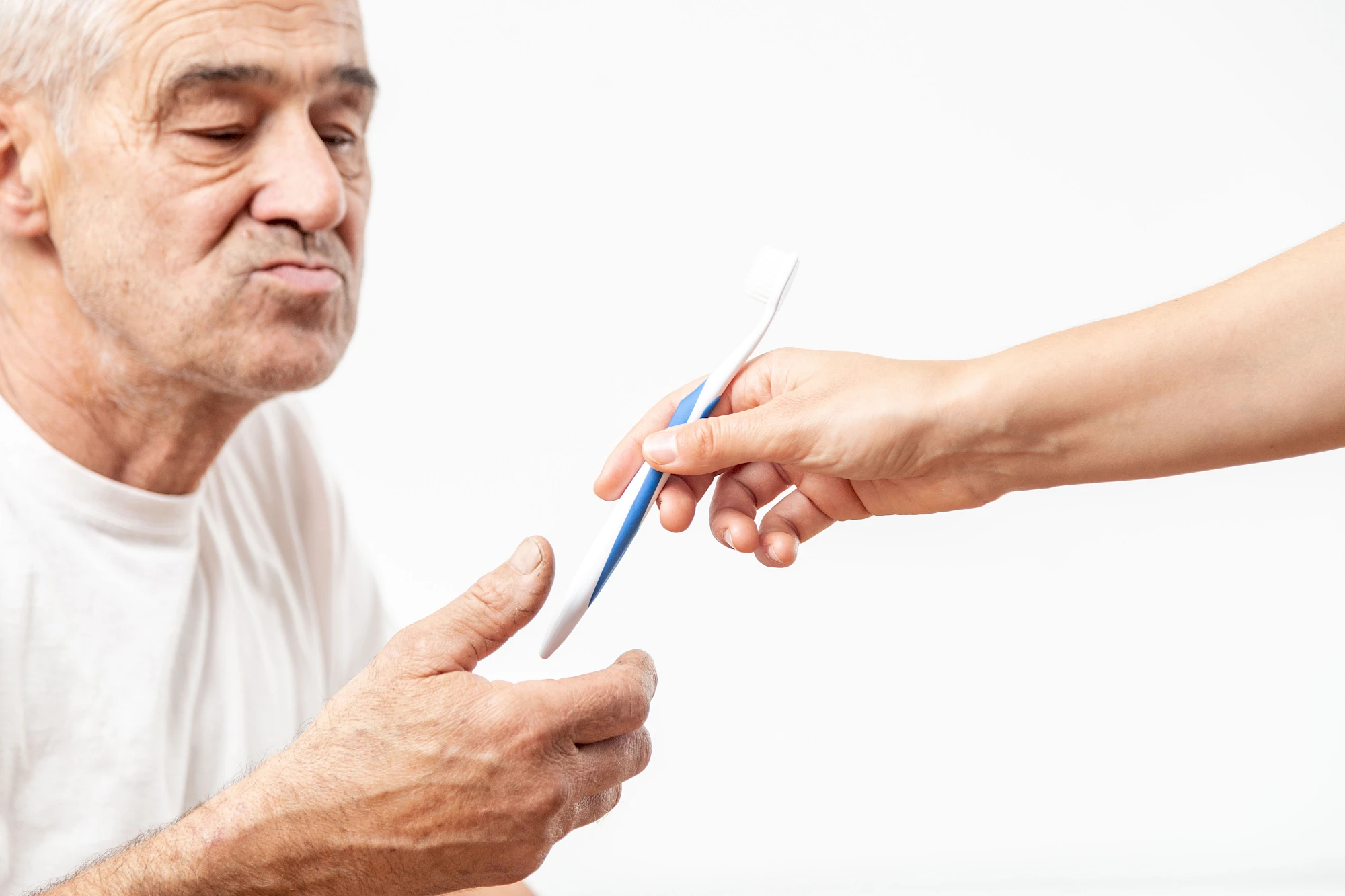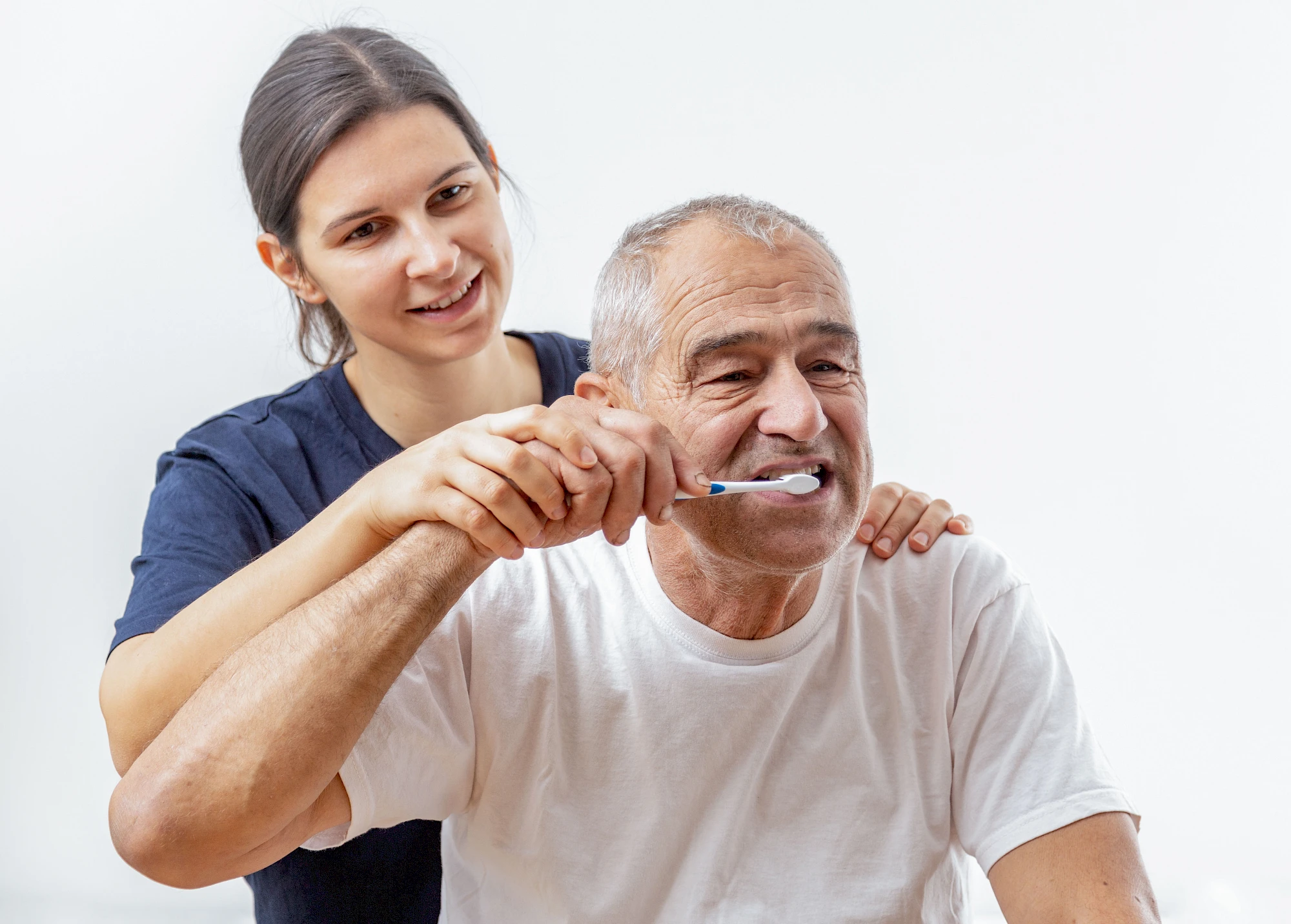 Hand über Hand: Legen Sie die eigene Hand auf die Hand der zu pflegenden Person und führen Sie die Bewegung gemeinsam aus. Oder legen Sie die Hand der zu pflegenden Person auf Ihren Unterarm und führen Sie so die Hand während der Mundpflege mit.