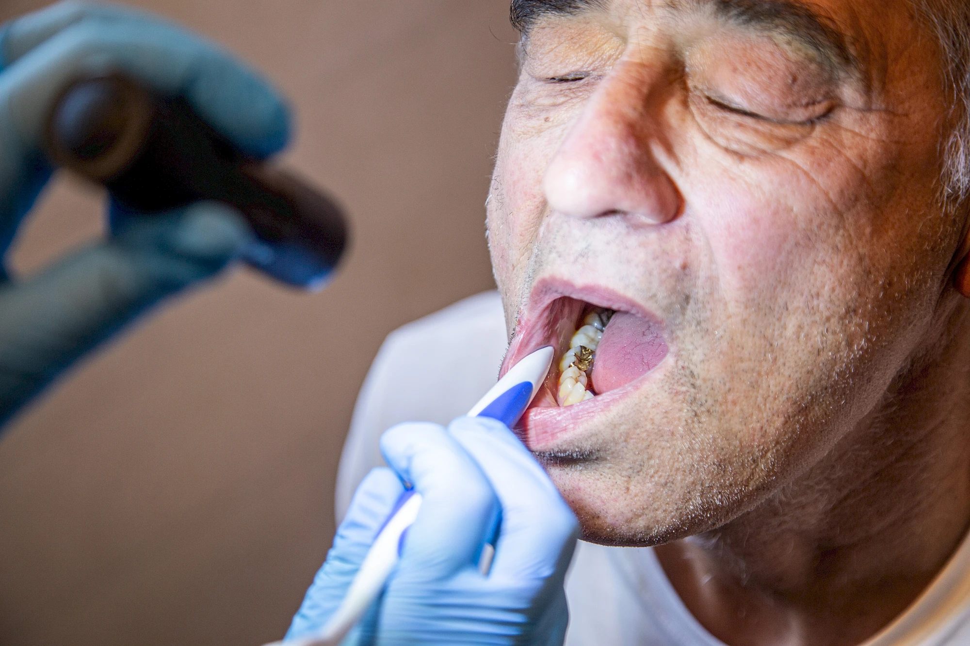 Die Inspektion der Mundhöhle sollte einmal in der Woche und in jedem Fall bei auffälligen Veränderungen erfolgen, um scharfe Kanten, Druckstellen oder andere Auffälligkeiten an Zähnen, Zunge und Schleimhäuten frühzeitig zu entdecken.