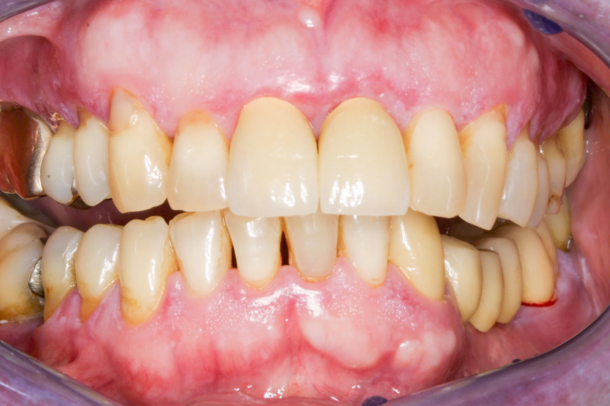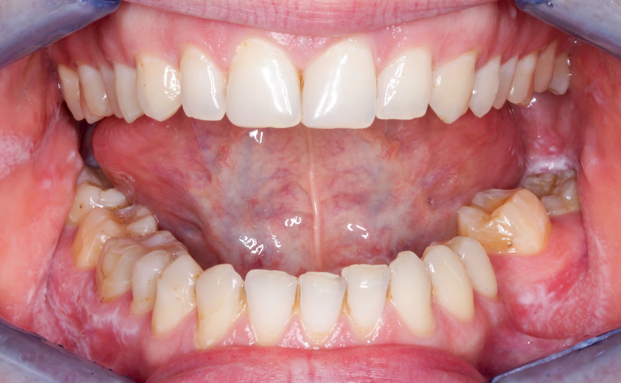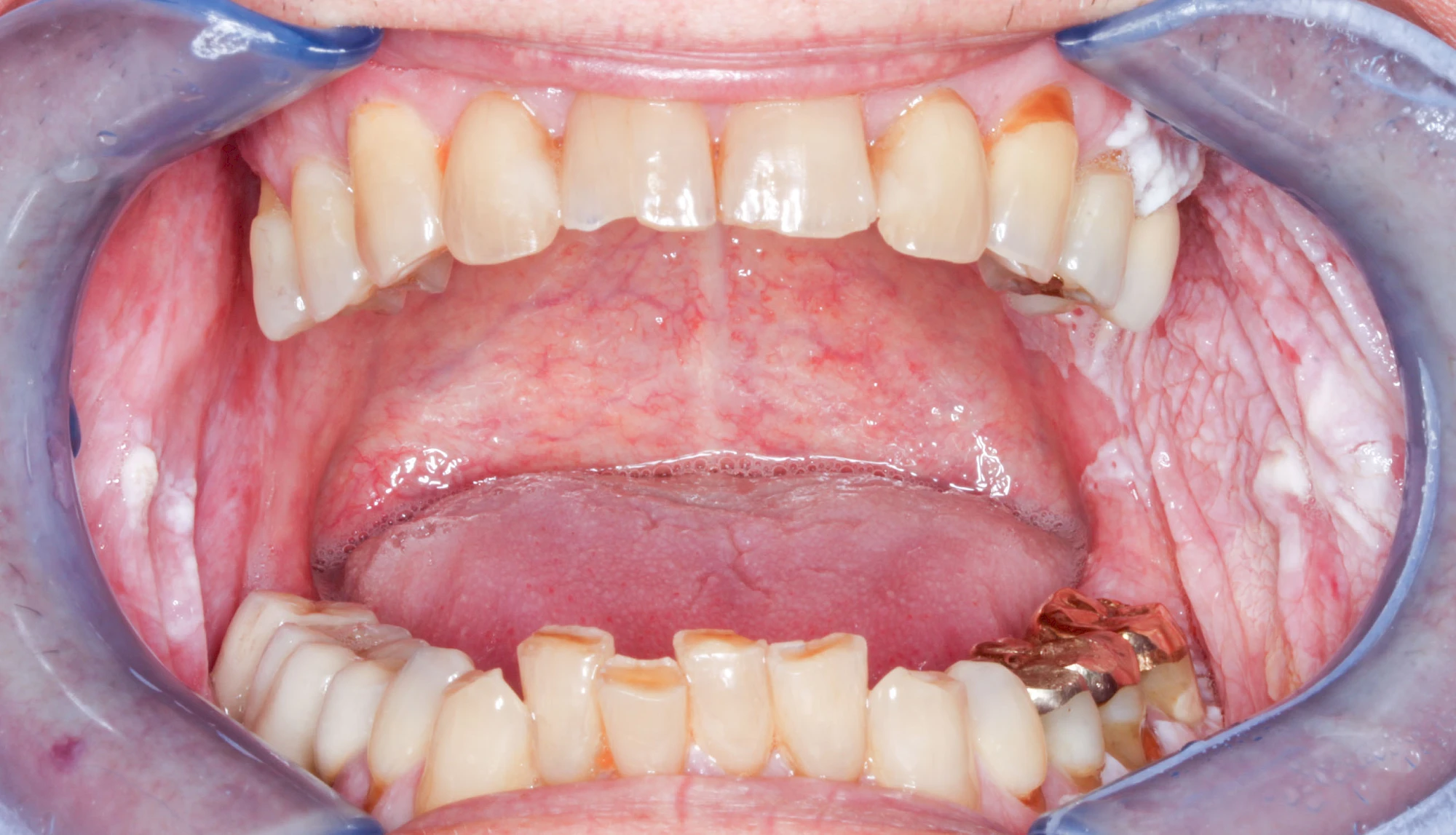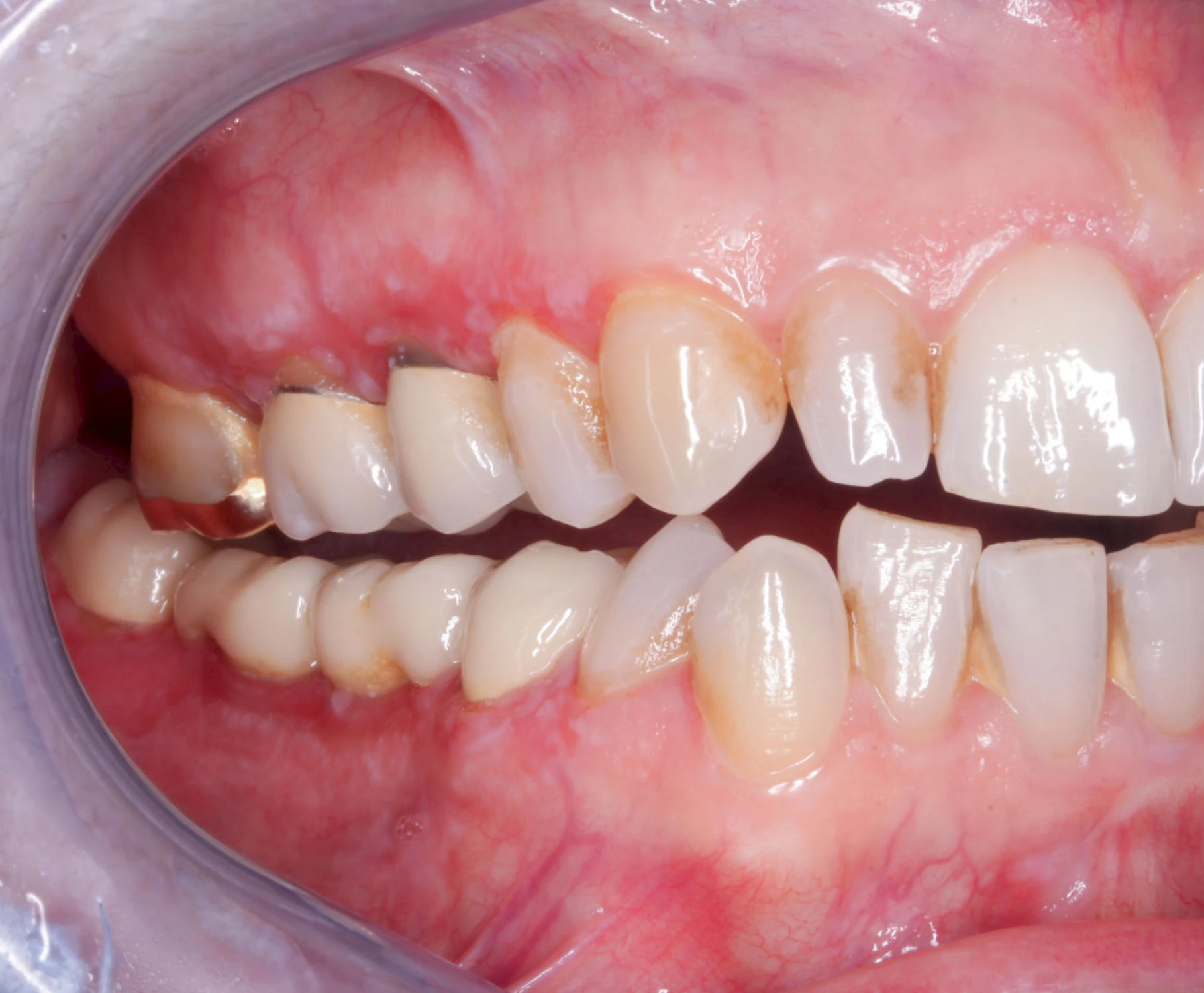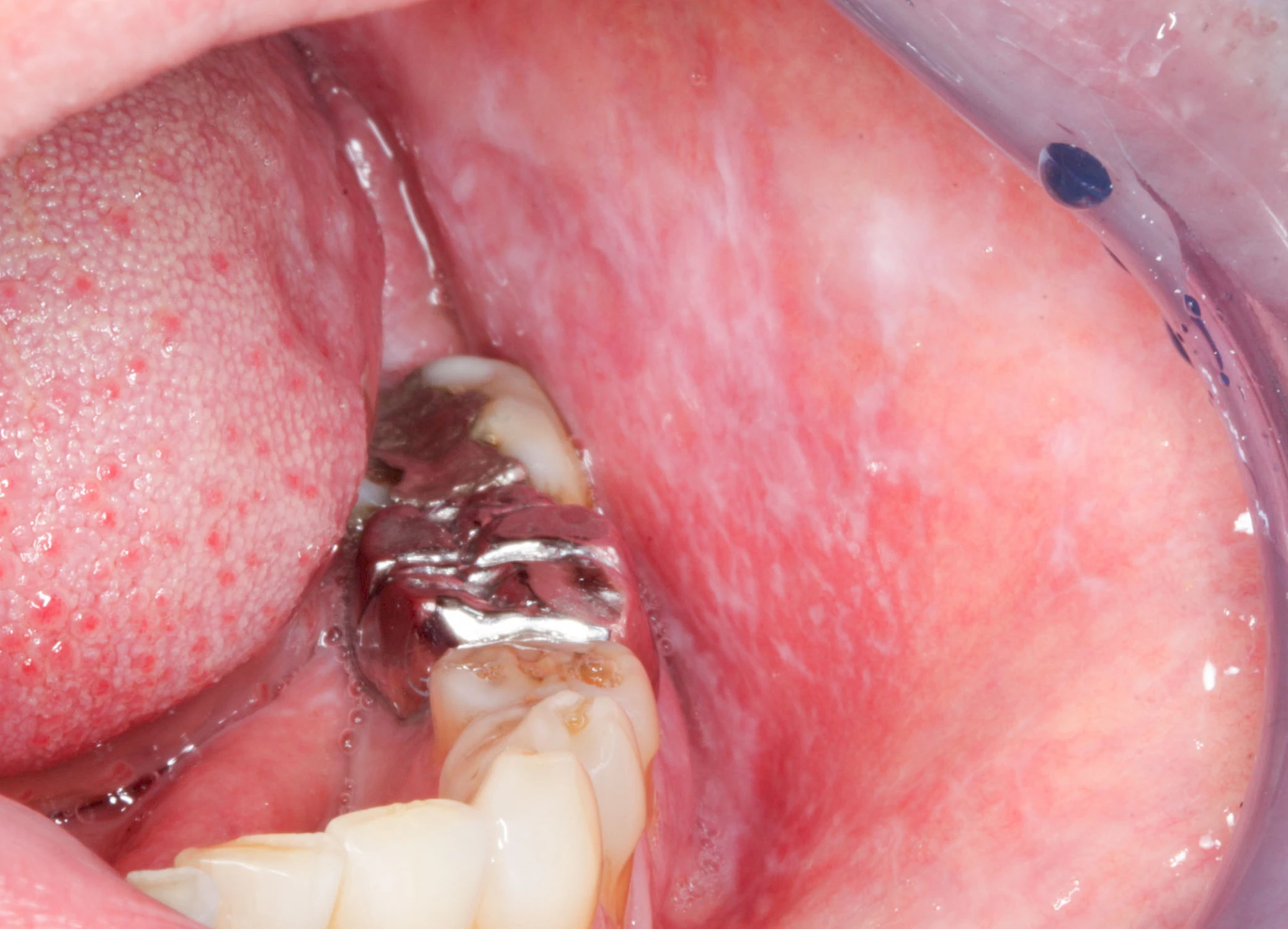 Häufig zu beobachten sind einzelne dunkle Flecken im Nahbereich der Zähne. Häufig handelt es sich dabei um Amalgam- oder Metall-Tätowierungen. Bei zahnärztlichen Behandlungen kann es zur "Versprengung" von Metall-Anteilen von Füllungen oder Kronen kommen. Diese lagern sich dann reizlos in die Schleimhaut ein.