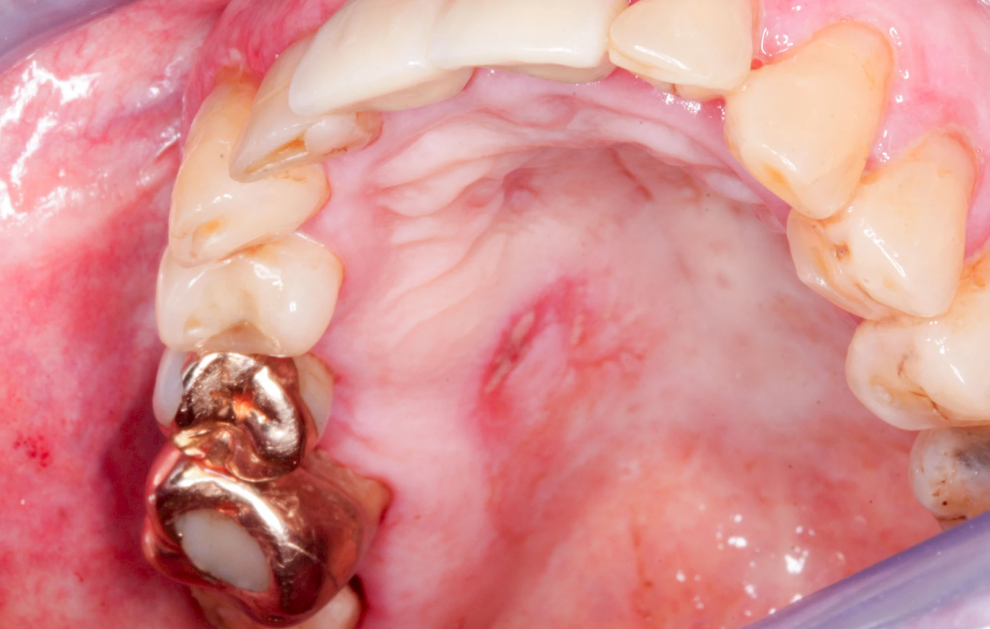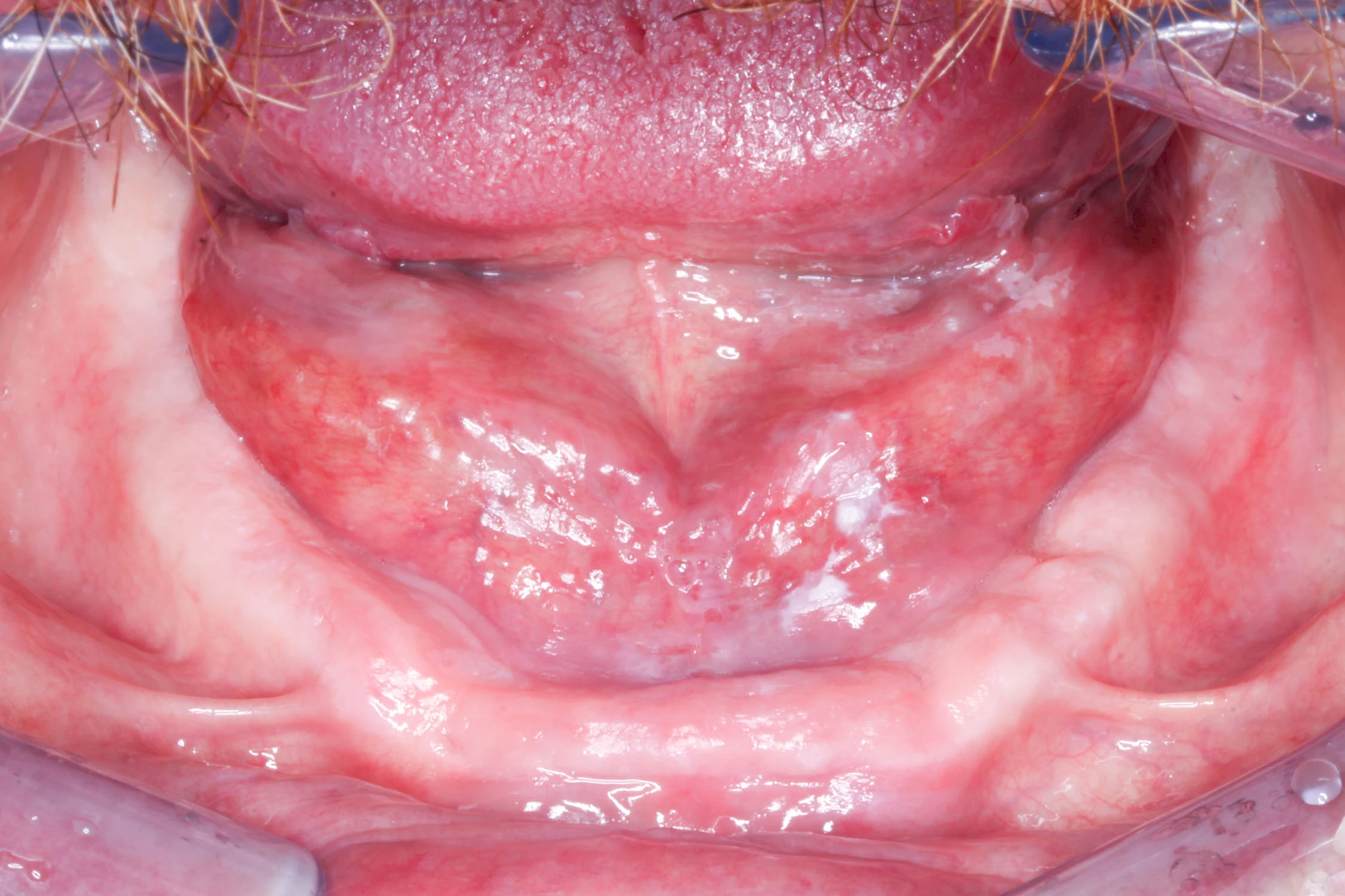 - Erosiv-atrophisch (ausgewaschen-verkümmert: Lichen erosivus) mit weißlichen, rötlichen, teilweise pseudomembranösen Schleimhauterosionen. Schmerzhaft, leicht blutend, Entartungsrisiko im Vergleich zu Lichen planus deutlich erhöht