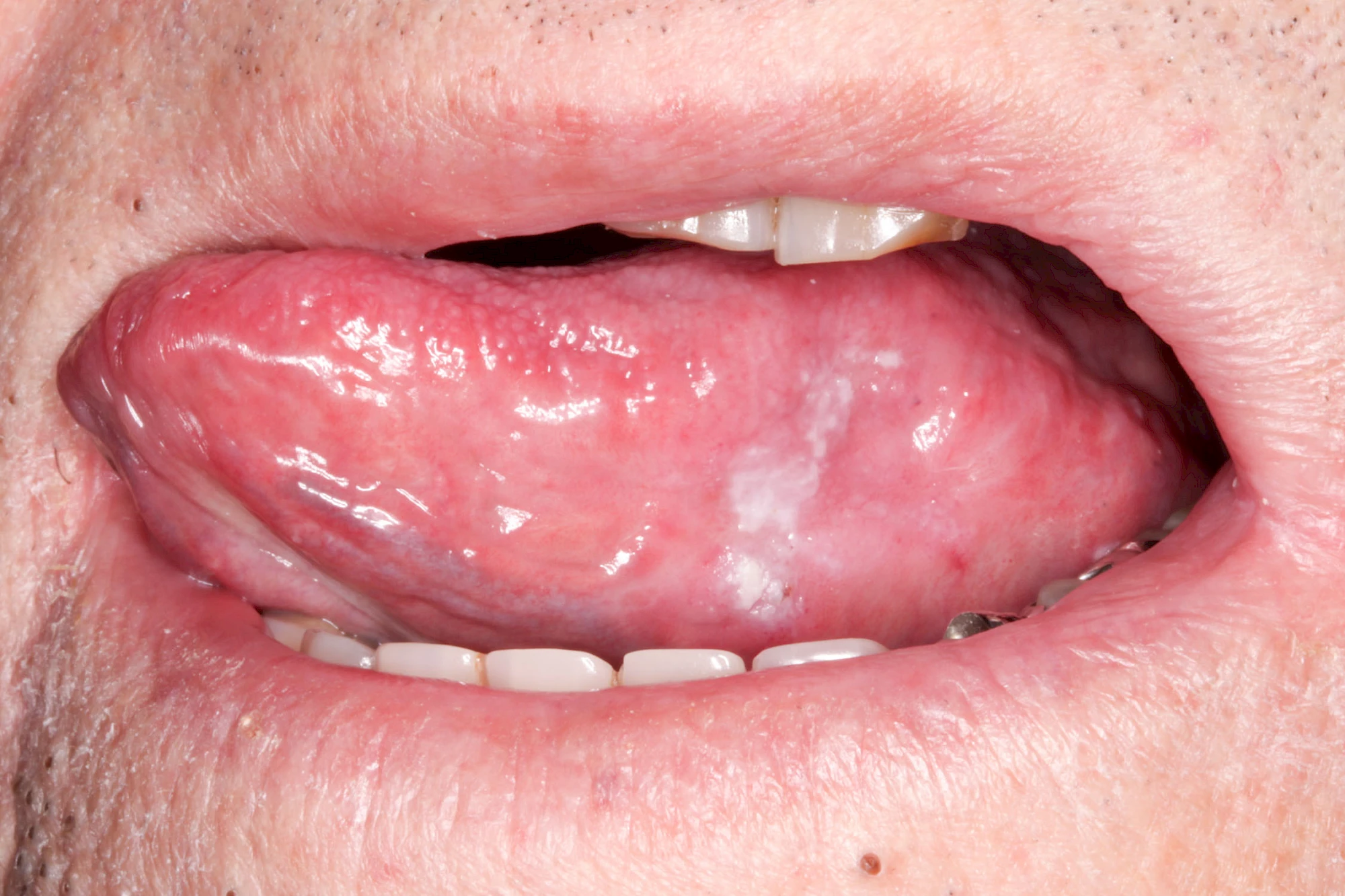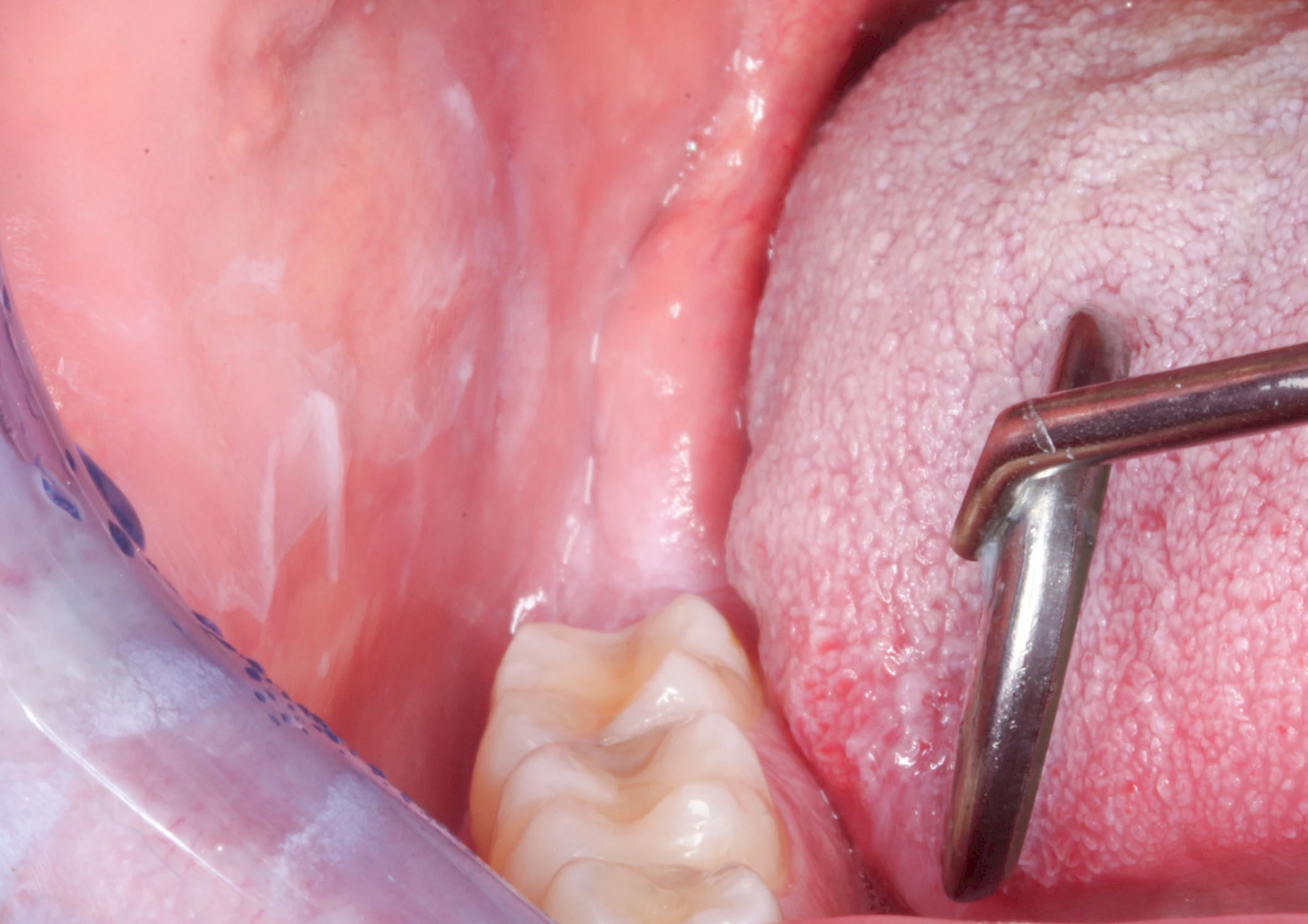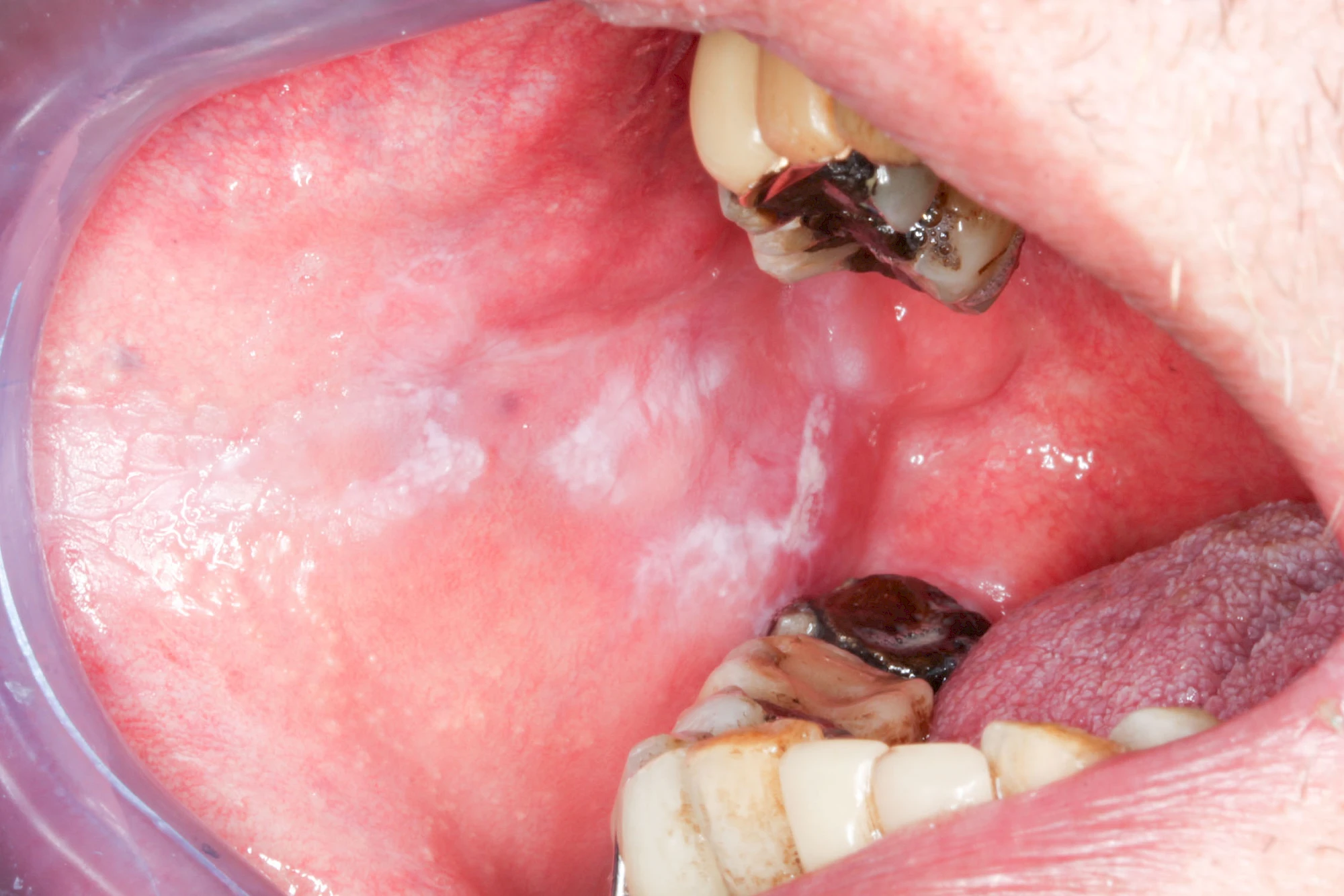 - Plan (Leukoplakia simplex bzw. plana): homogen-weiß, meist klar begrenzt, Oberfläche glatt. Entartungsrisiko 0–3 %