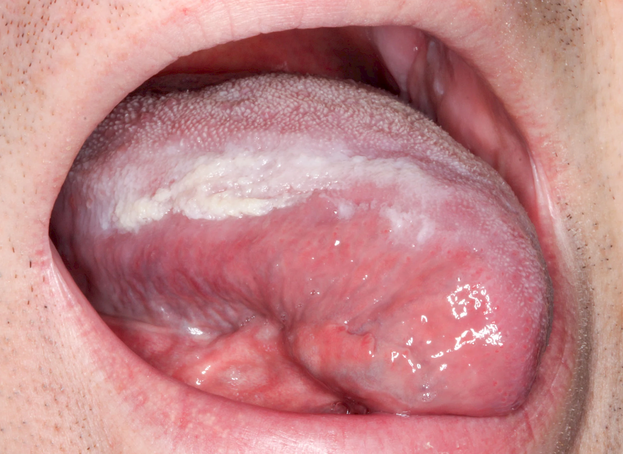 Zudem gibt es Stadien der Pilzerkrankungen, bei denen sich der Pilz nicht gleich abwischen lässt, weil der Pilz in tiefere Schleimhautschichten eingedrungen ist. An der Zunge fällt zusätzlich auf, dass in diesen Fällen nicht nur die Zungenoberseite, sondern der gesamte Zungenkörper – mindestens jedoch auch die Zungenränder – betroffen sind.