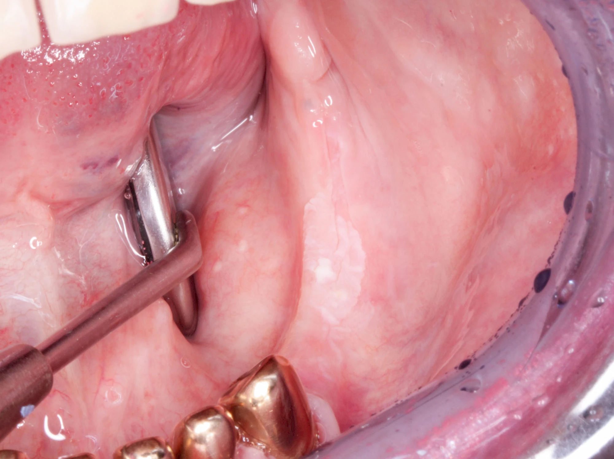 - Retikulär (netzförmig: Lichen planus) mit weißlichen Epithelveränderungen (Wickhamsche Streifen). Entartungsrisiko: 0,4–2,5 %