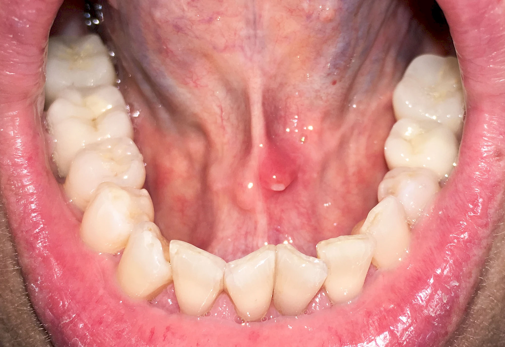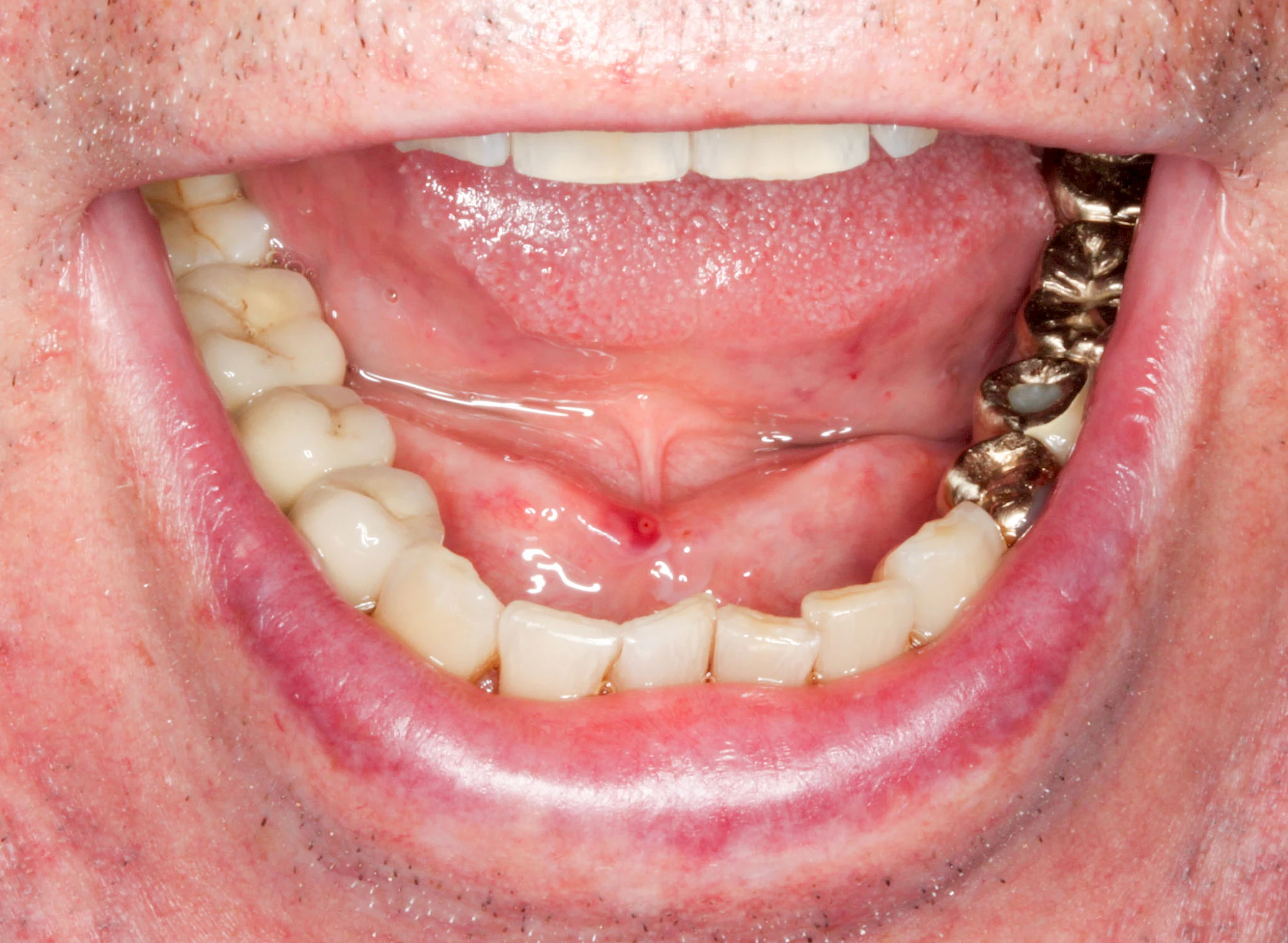 Einzündungen der kleinen Speicheldrüsen im Gaumen fallen dagegen durch kleine punktförmige Rötungen auf. Wenn ausreichende Flüssigkeitszufuhr und ggf. sanftes Massieren der Speicheldrüsen und der Ausführungsgänge (z. B. Parotitisprophylaxe) keine Verbesserung erzielen lassen oder wenn zusätzliche Symptome wie z. B. Fieber auftreten, sollte ein Arzt oder Zahnarzt hinzugezogen werden.