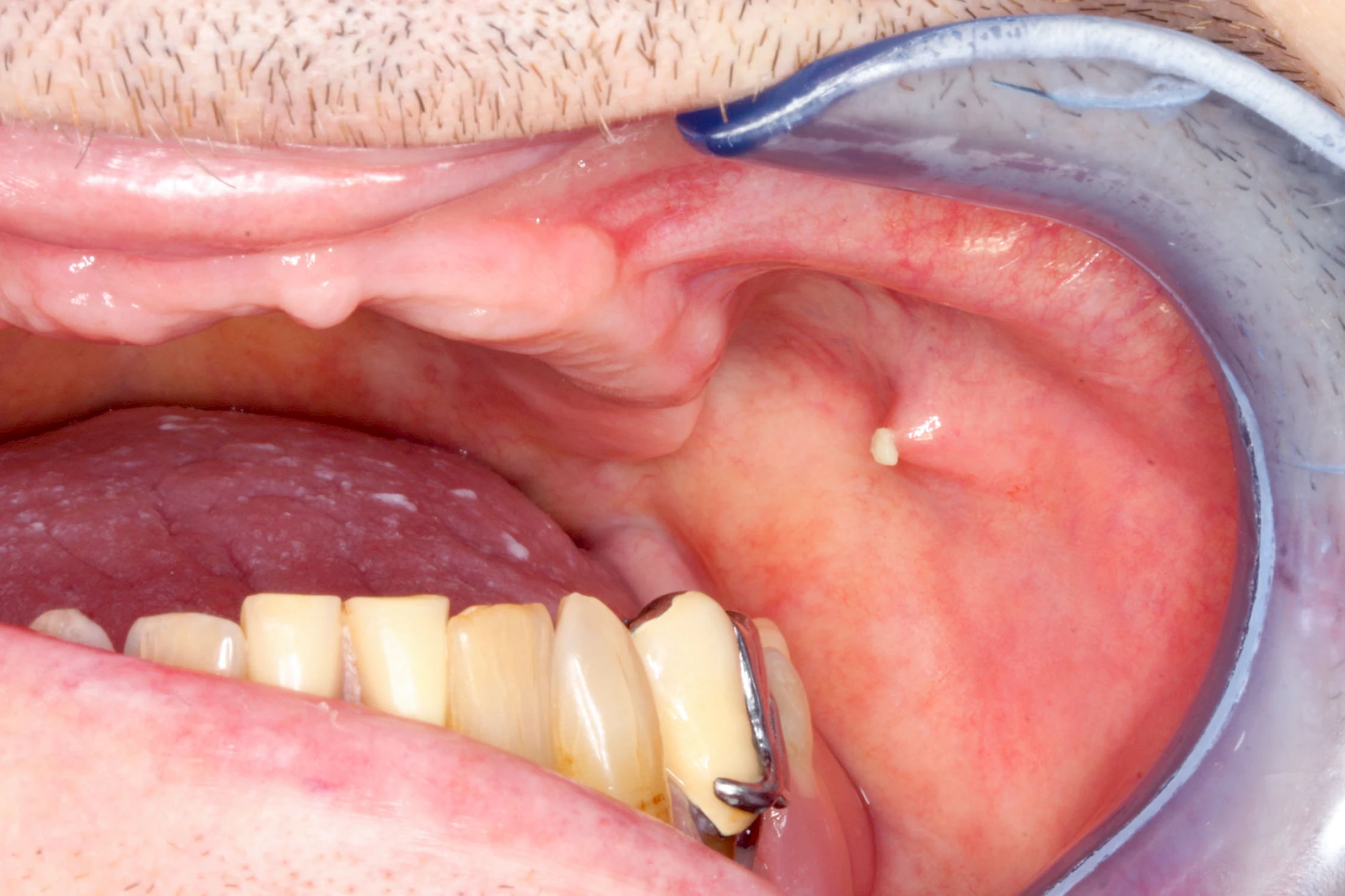 Milchiges bzw. gelbliches Sekret im Bereich der Speichelausführungsgänge entweder an den Wangeninnenseiten auf Höhe der ersten großen Backenzähne im Oberkiefer oder unter der Zunge können auf Entzündungen der großen Spreicheldrüsen hinweisen. Ebenso Schwellungen bzw. Auftreibungen, Rötungen oder spürbare Wärme einseitig unterhalb eines Ohrs und im Bereich des Kieferwinkels.