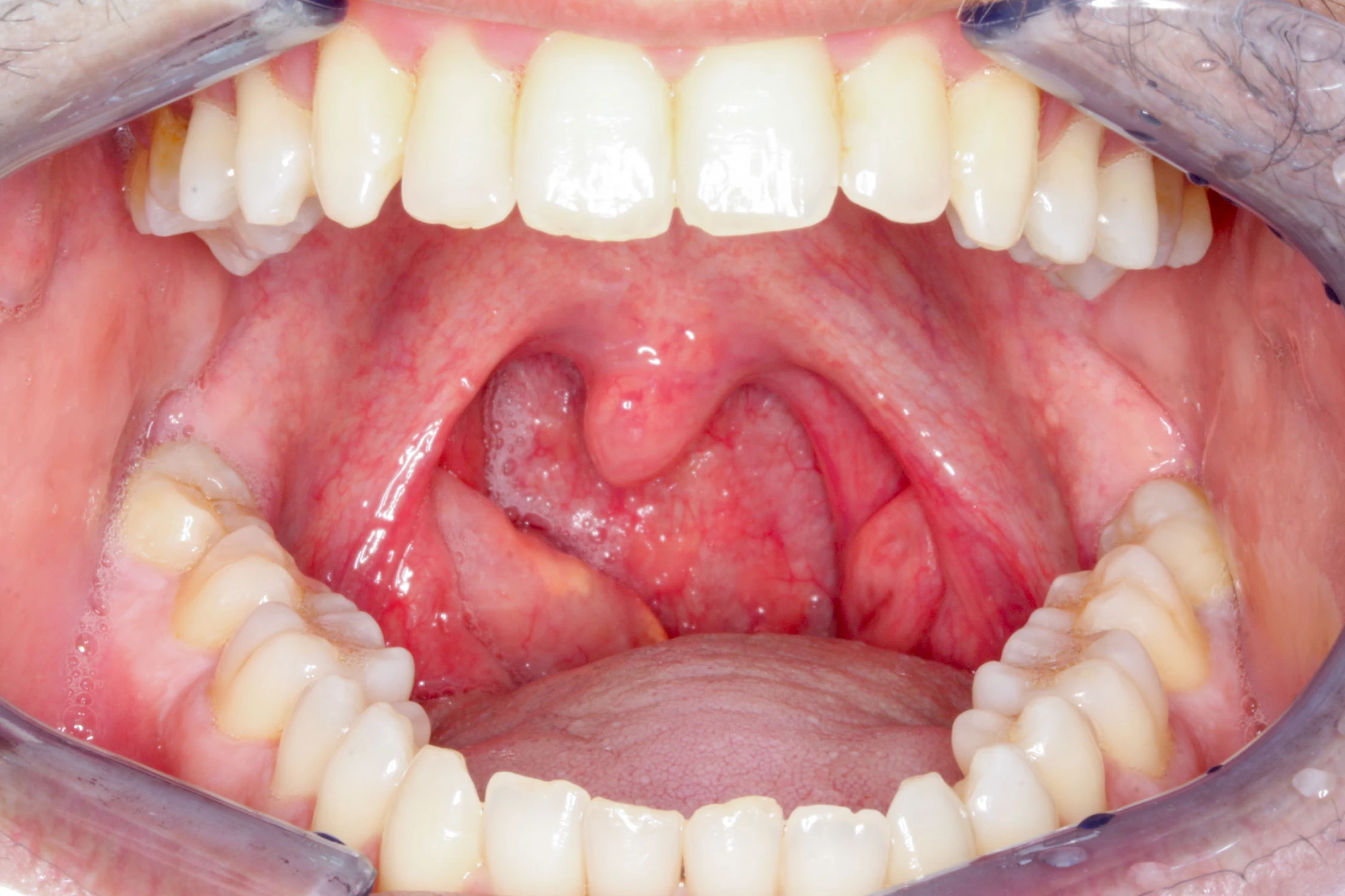 - Entzündungen: Rötungen bzw. Schwellungen der Gaumen- bzw. der Rachenmandeln