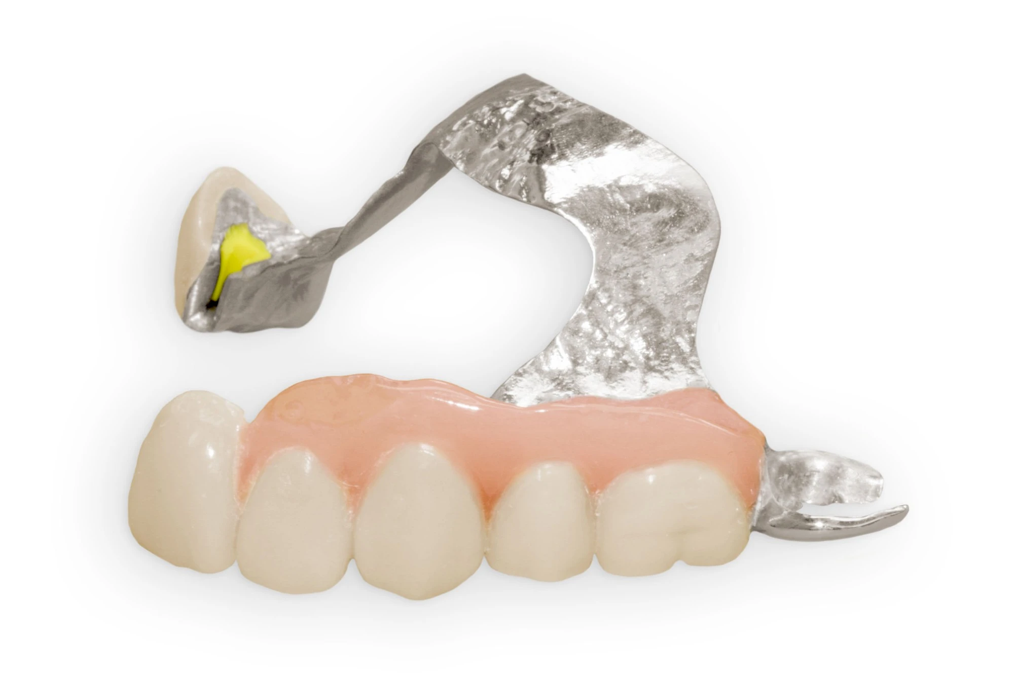 - Zähne (meist aus Kunststoff) auf rosafarbenen Kunststoff-Sätteln, die den zahnlosen Kieferabschnitten aufliegen